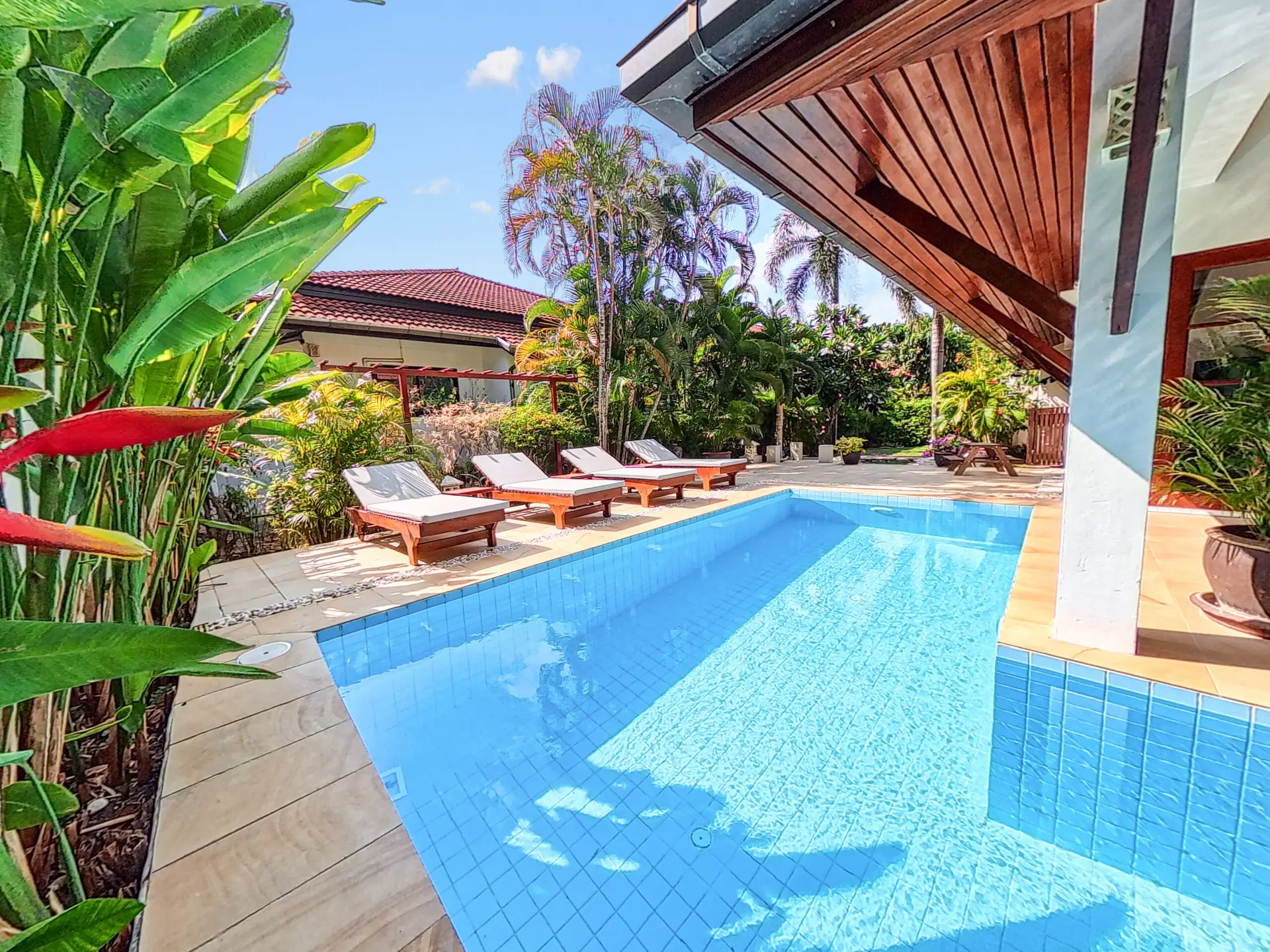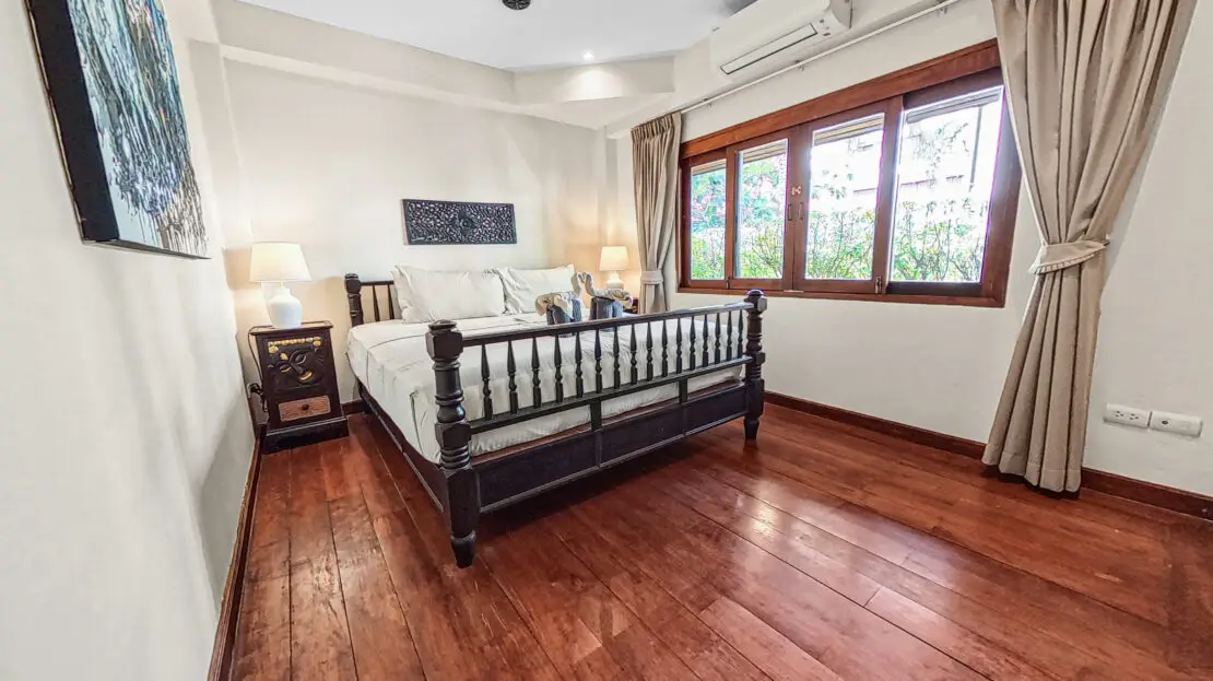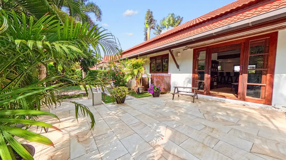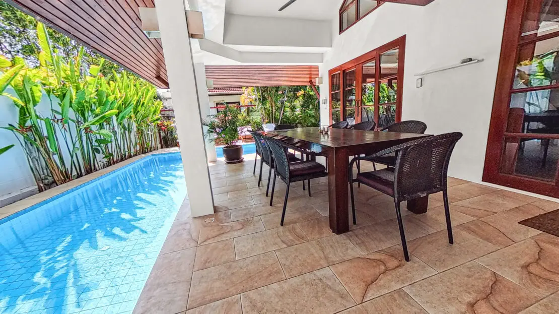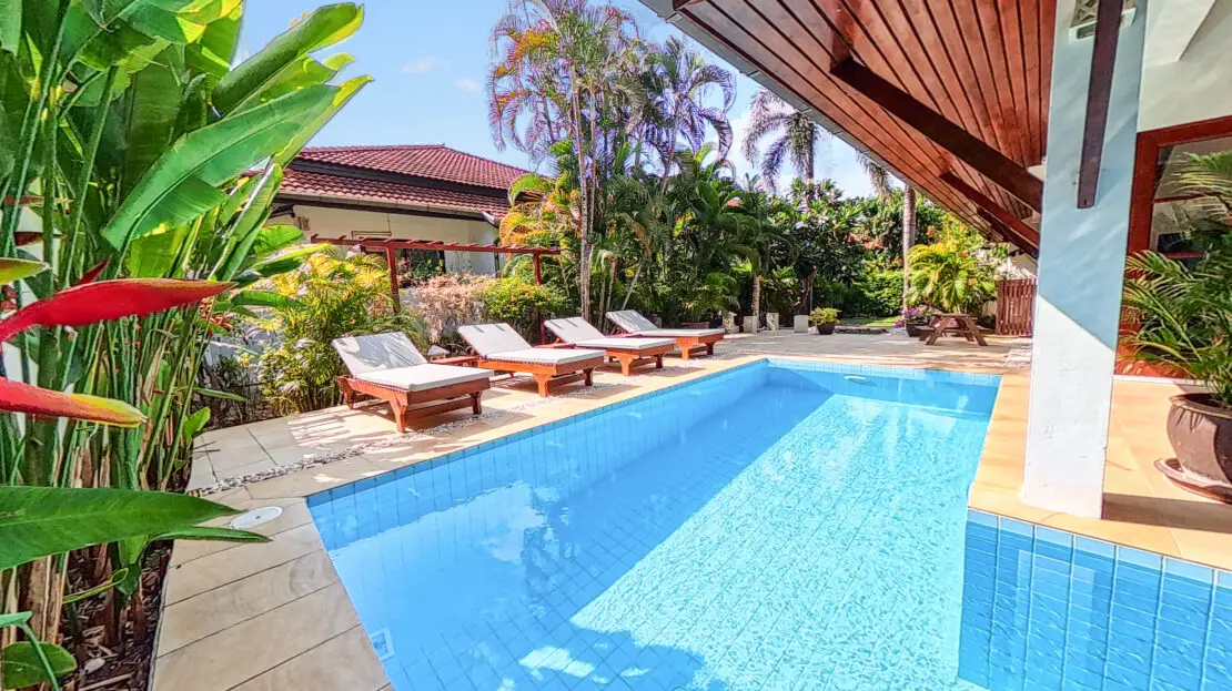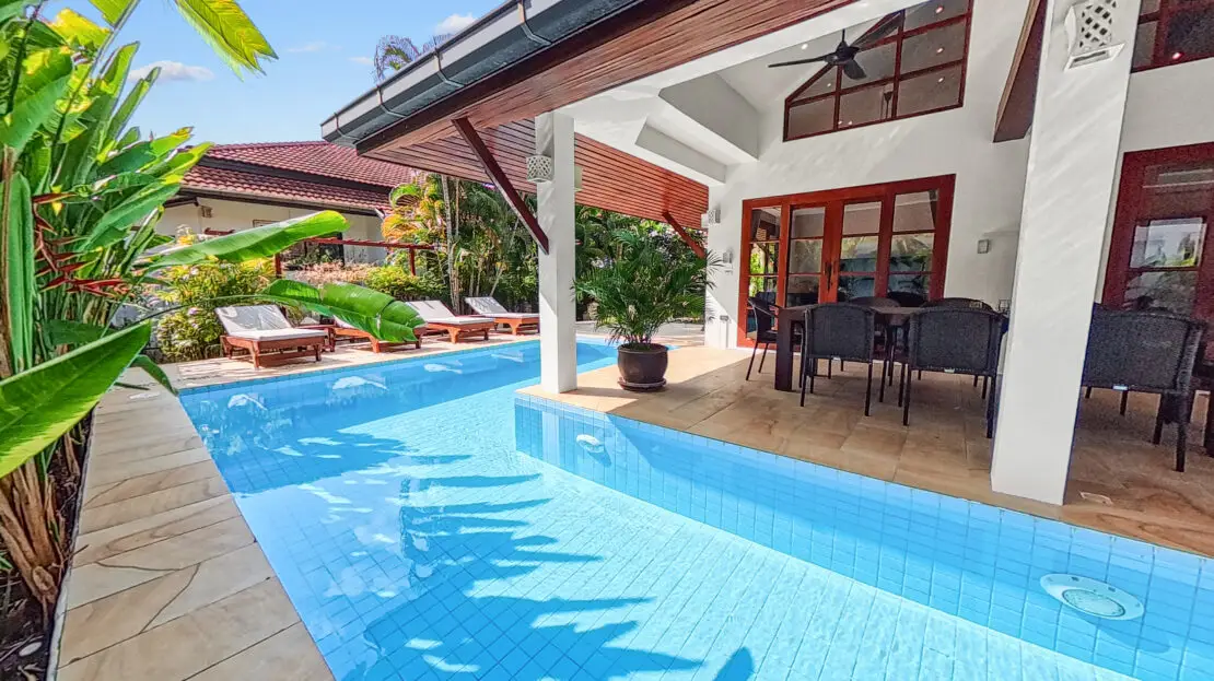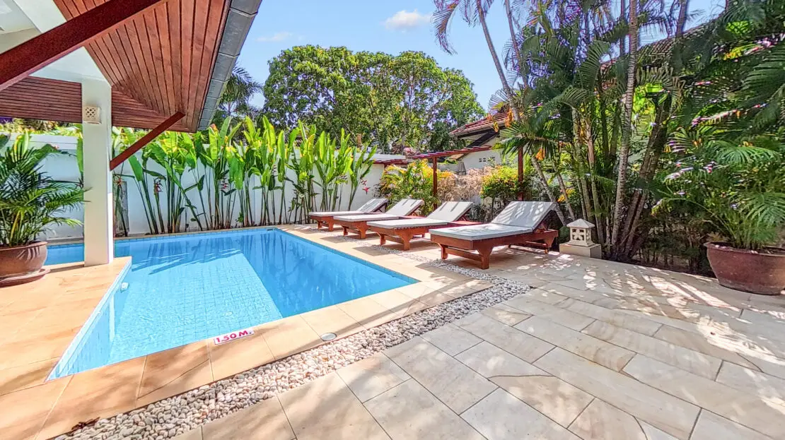 Malee Beach C1 includes a private tropical garden where you can relax in the sun during the day and enjoy cooler breezes in the evening. The L-shaped pool is ideal for swimming and relaxing, with a sheltered layout that works well for both quiet mornings and time with family.