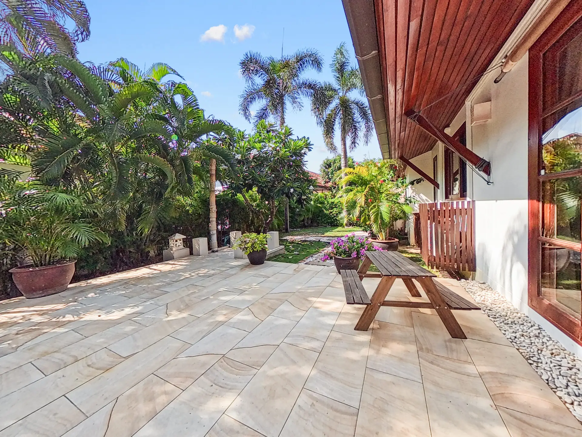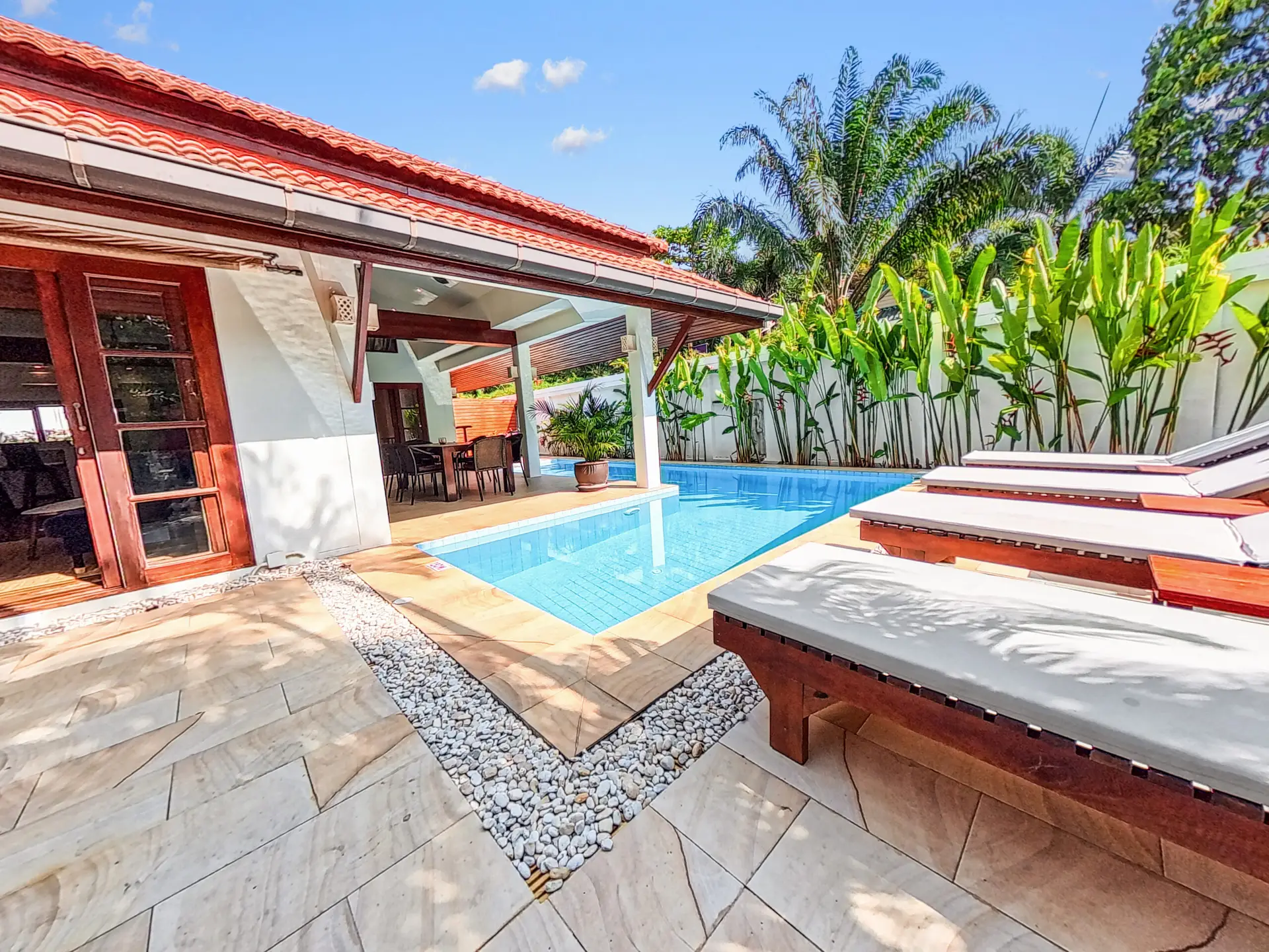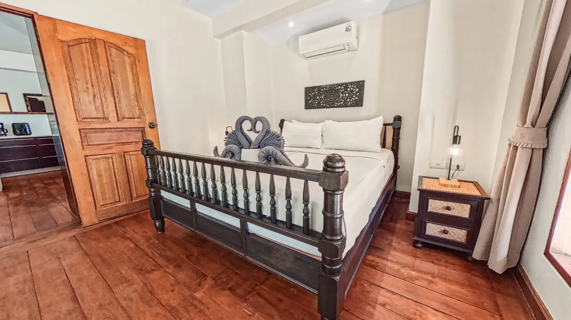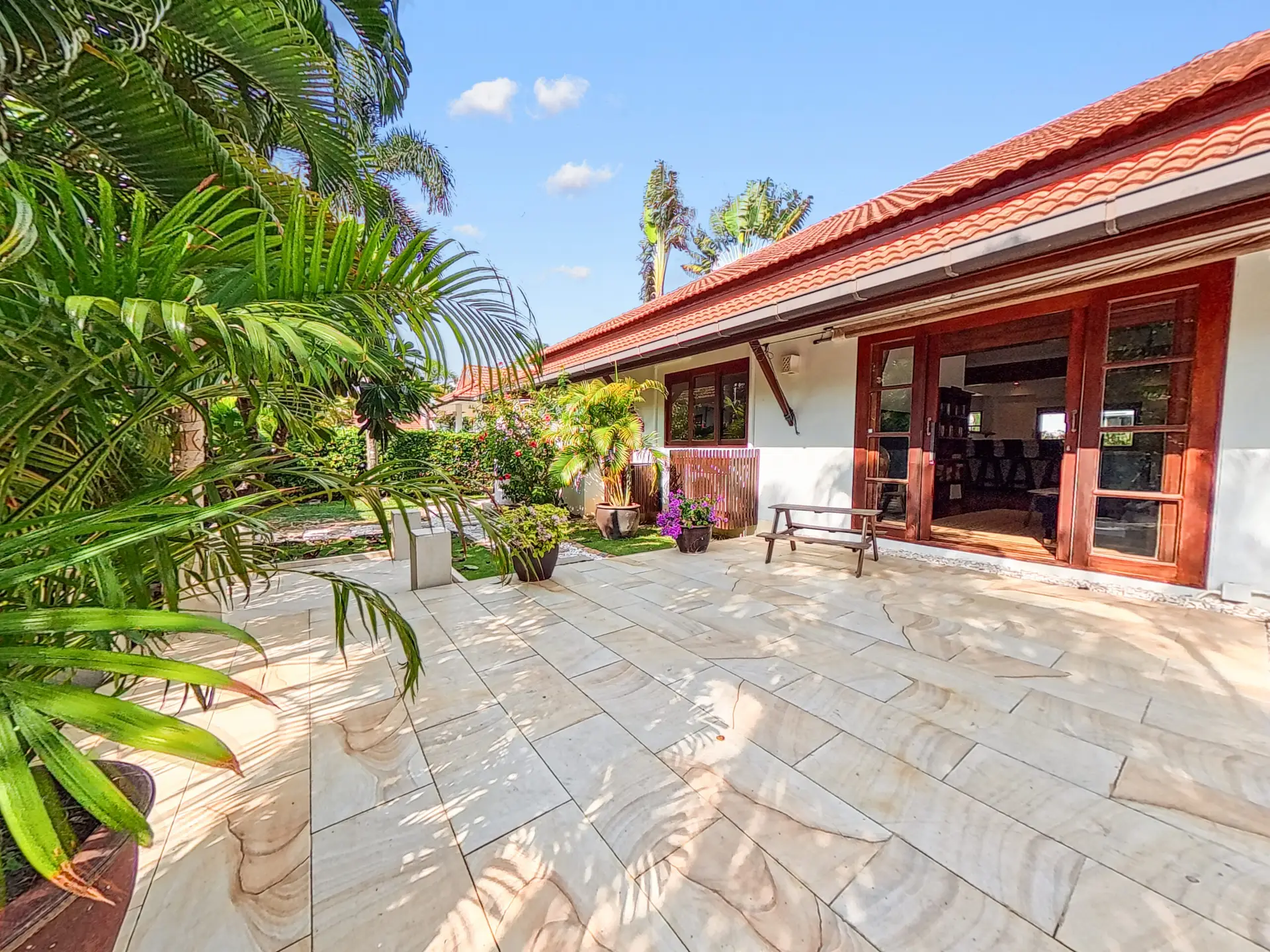 Malee Beach C1 includes a private tropical garden where you can relax in the sun during the day and enjoy cooler breezes in the evening. The L-shaped pool is ideal for swimming and relaxing, with a sheltered layout that works well for both quiet mornings and time with family.