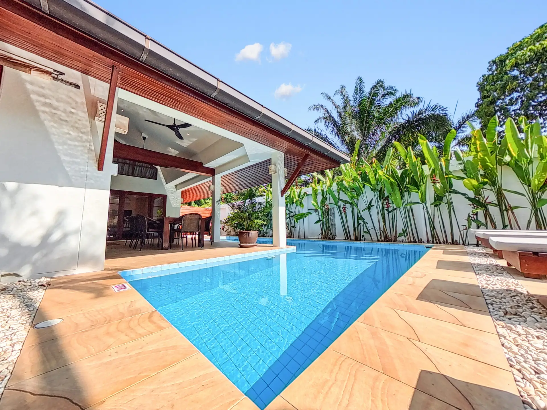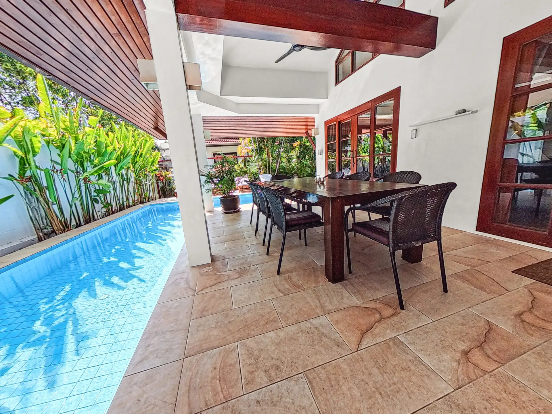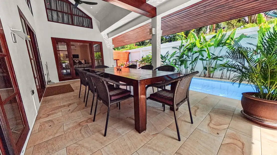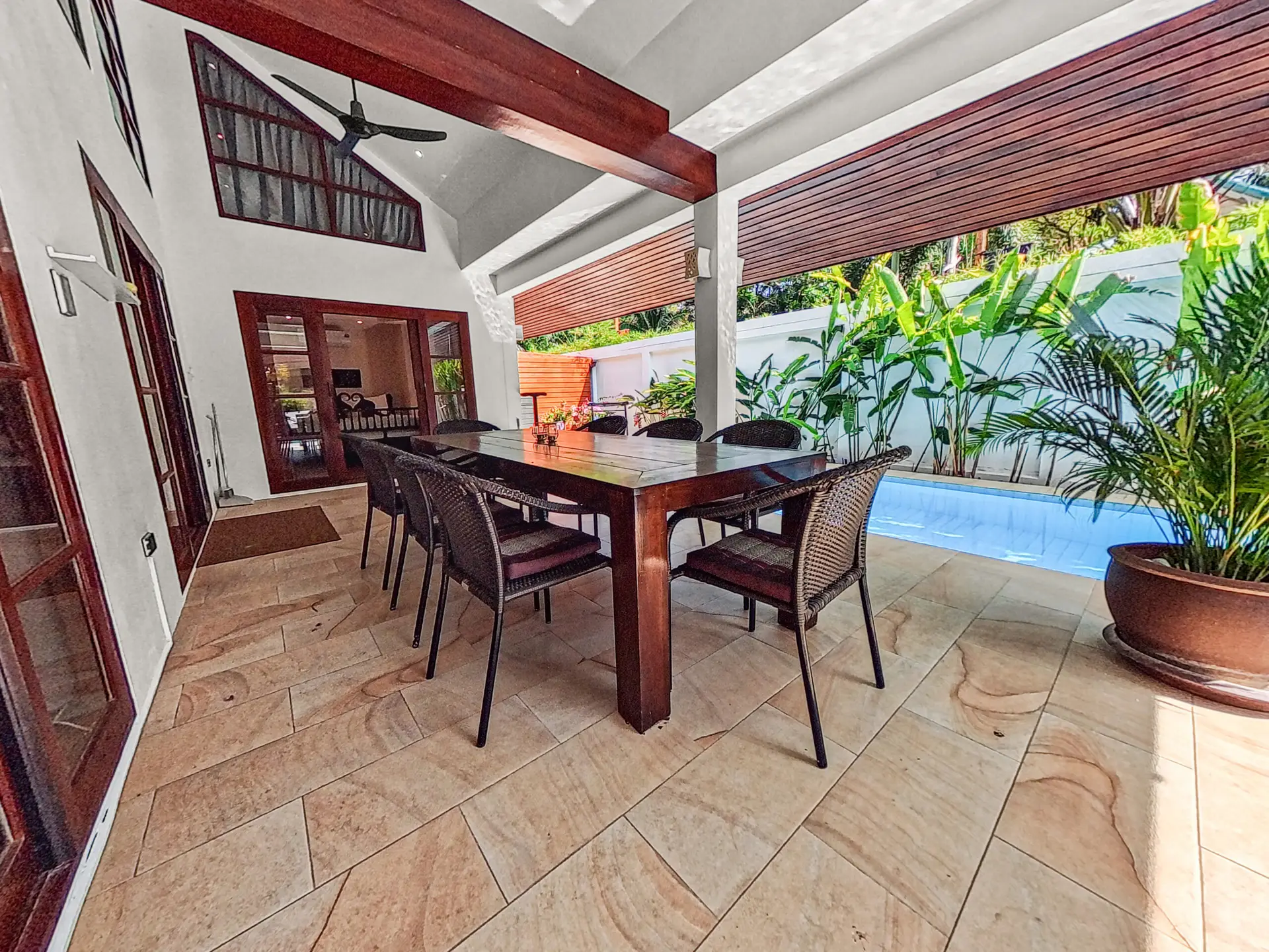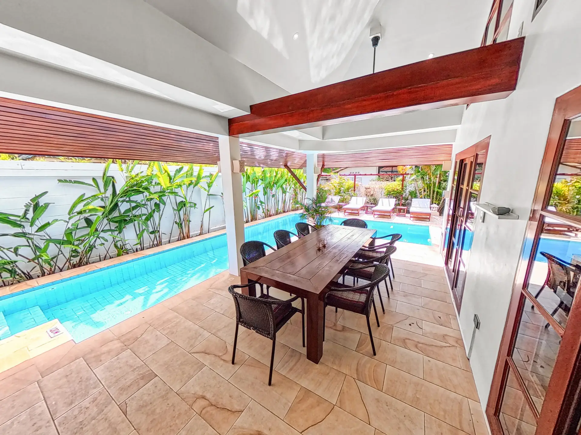 Covered terrace, Dining table for 8 people, Ceiling fans, Four sun loungers, Direct access to the private L-shaped pool