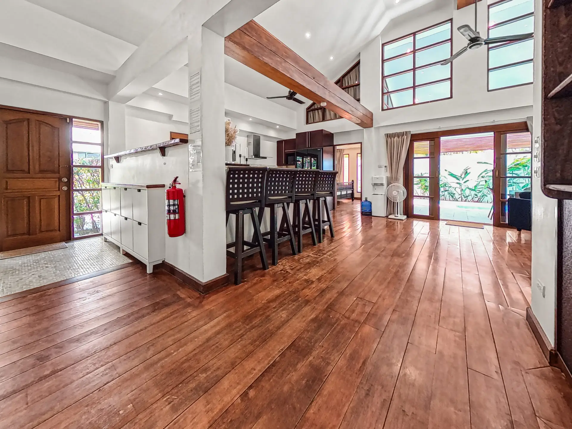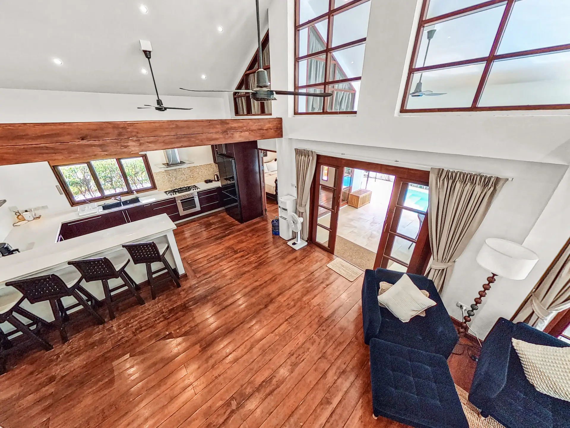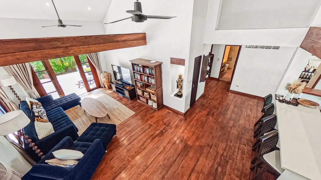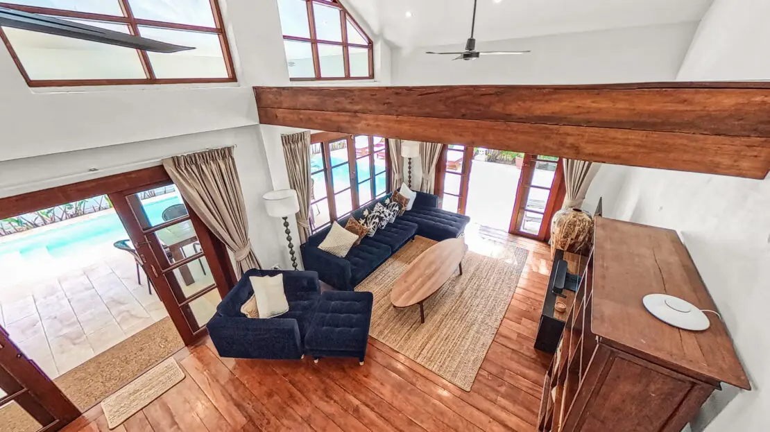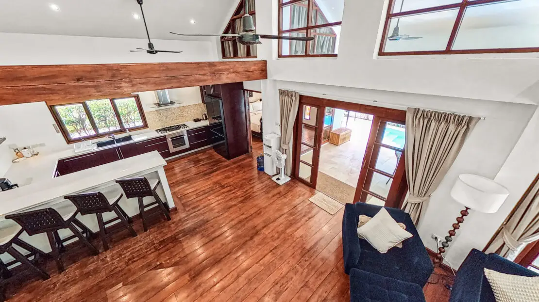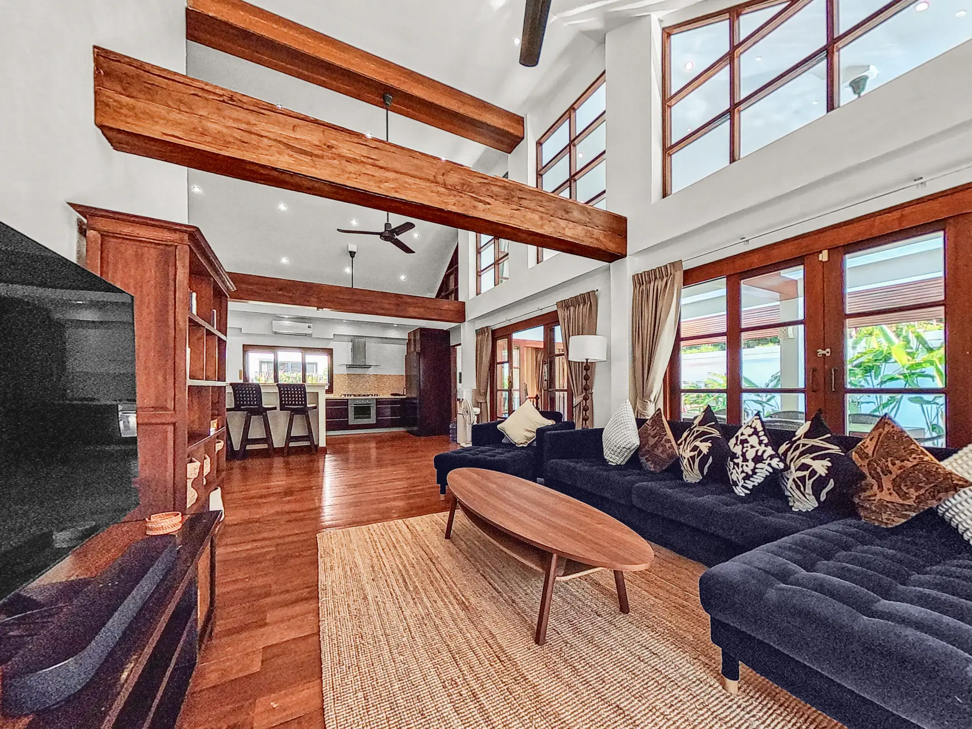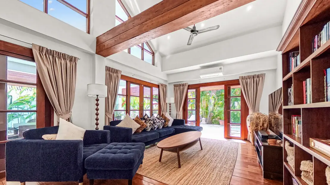 The villa has a bright and open feel with generous living areas and high ceilings. Large glass doors bring in natural light and connect indoor and outdoor spaces.