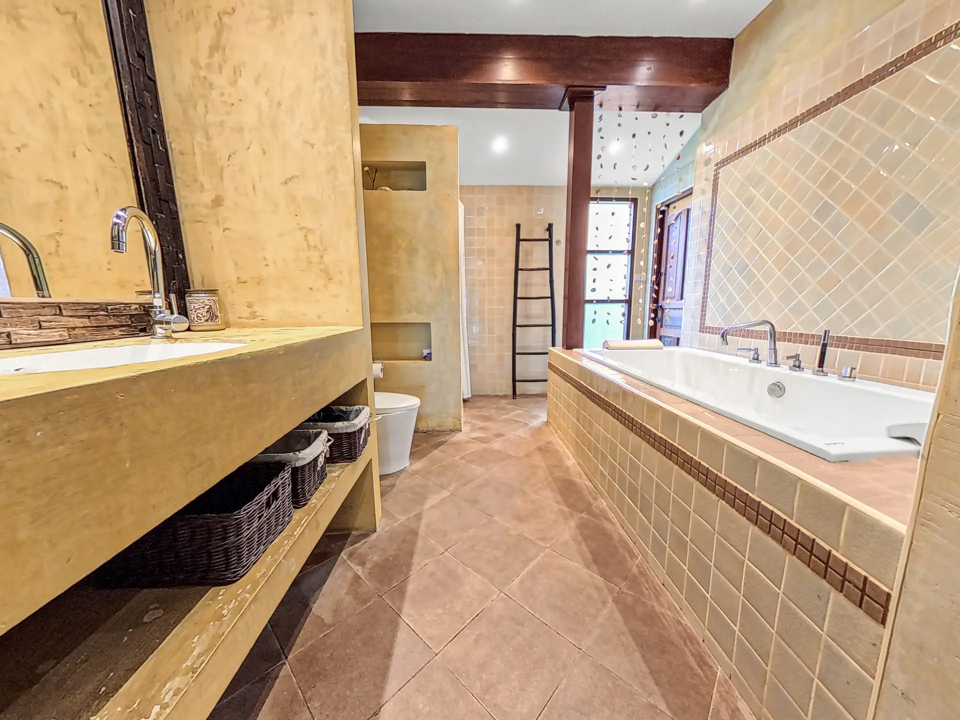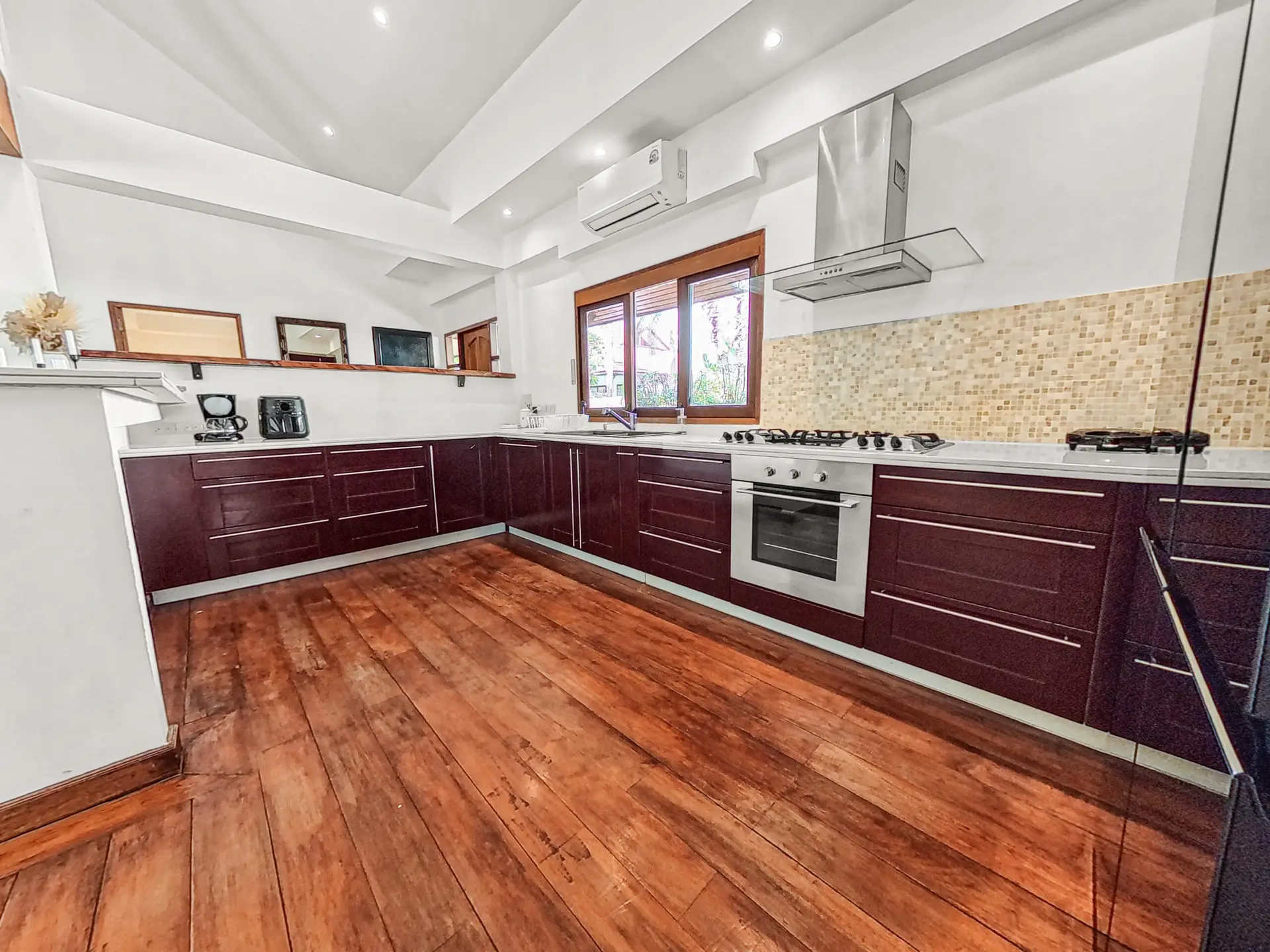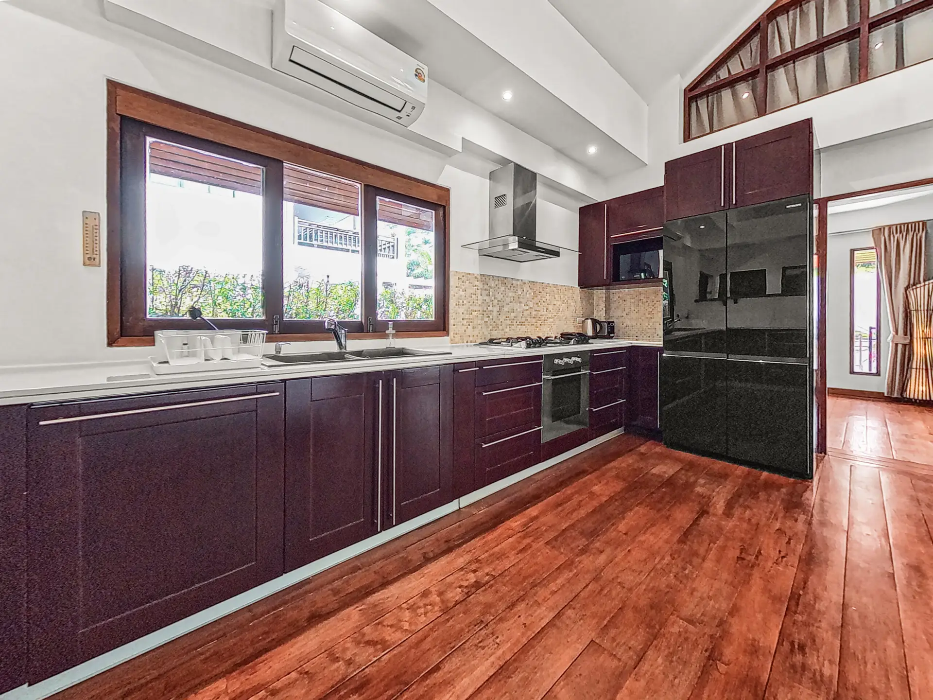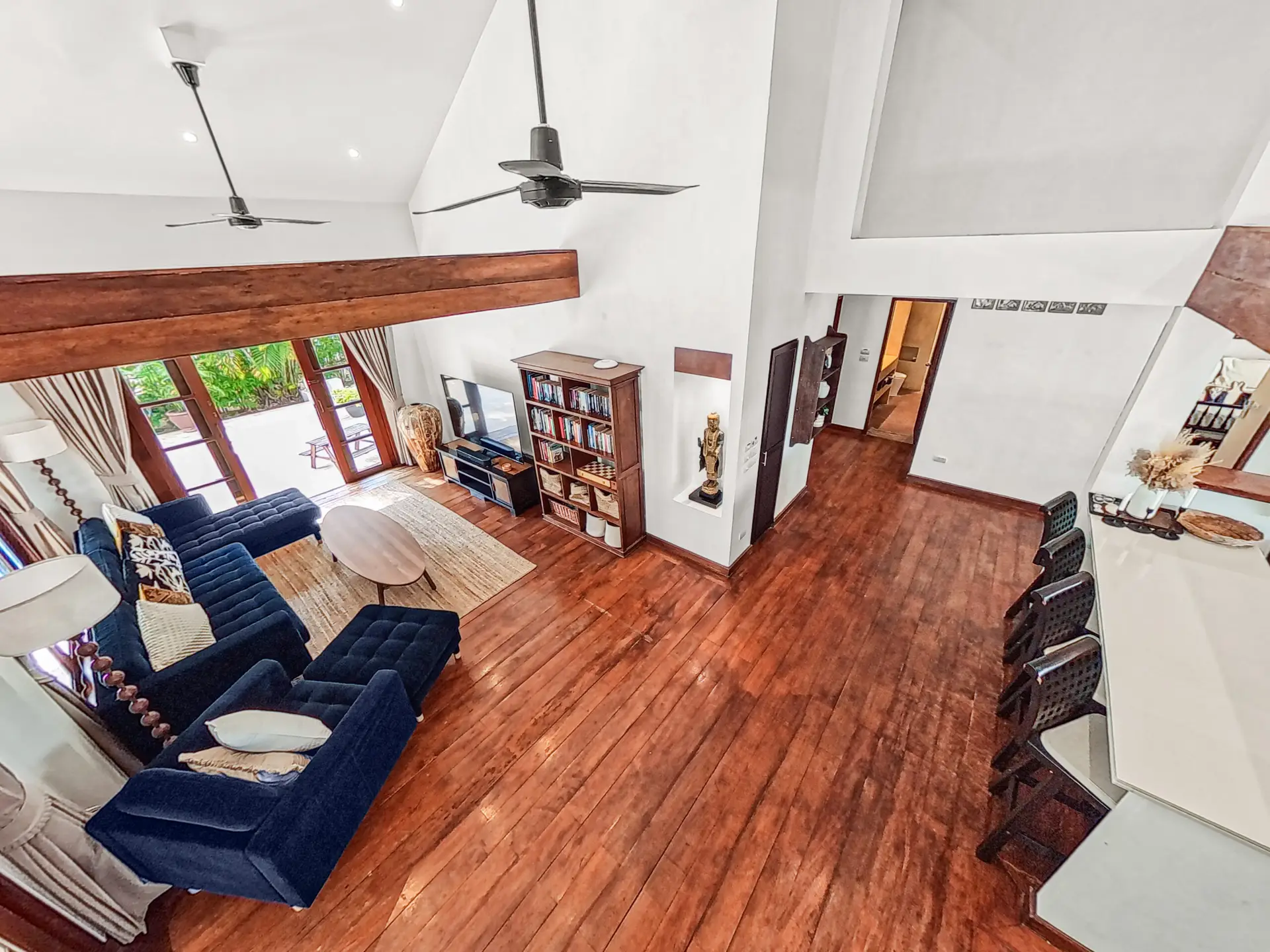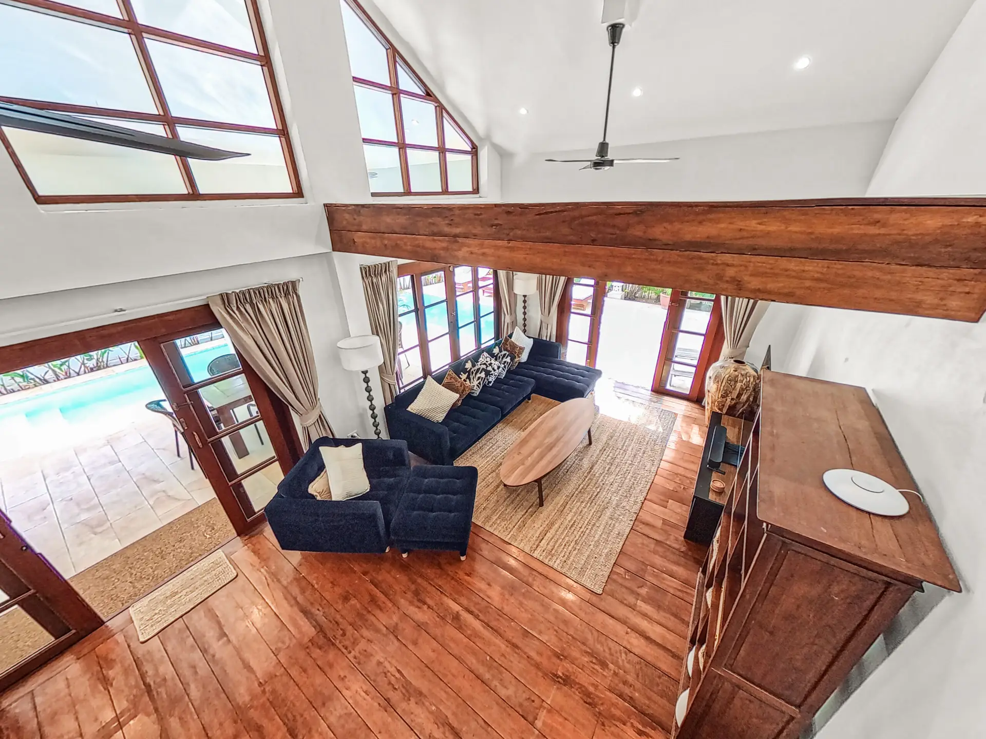 The villa has a bright and open feel with generous living areas and high ceilings. Large glass doors bring in natural light and connect indoor and outdoor spaces.