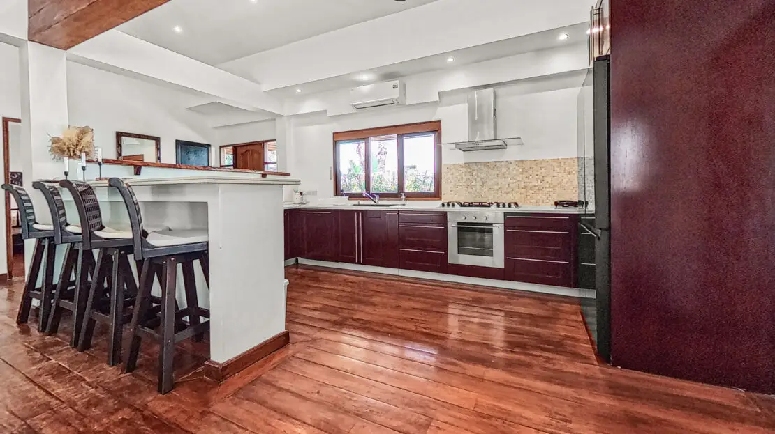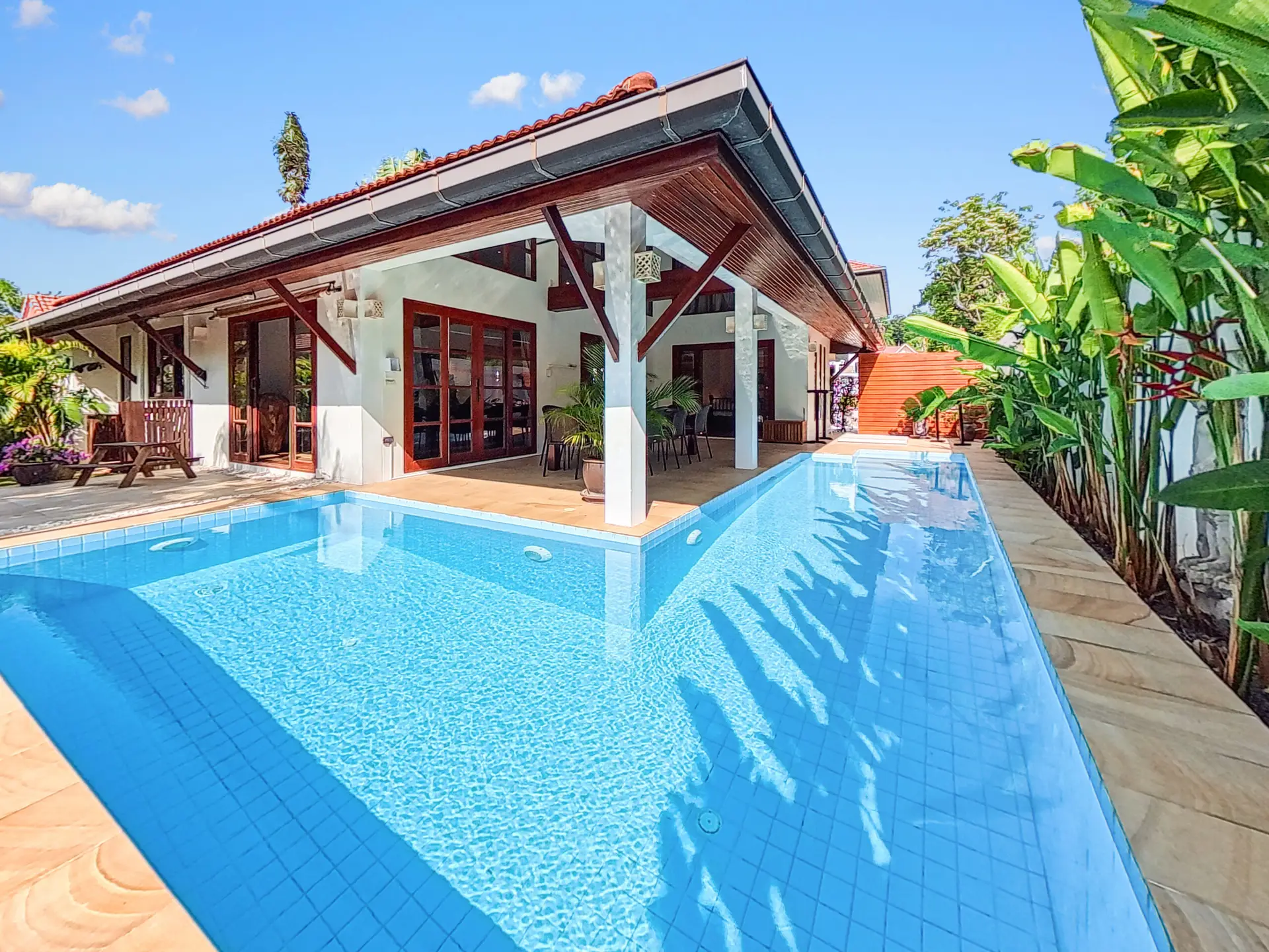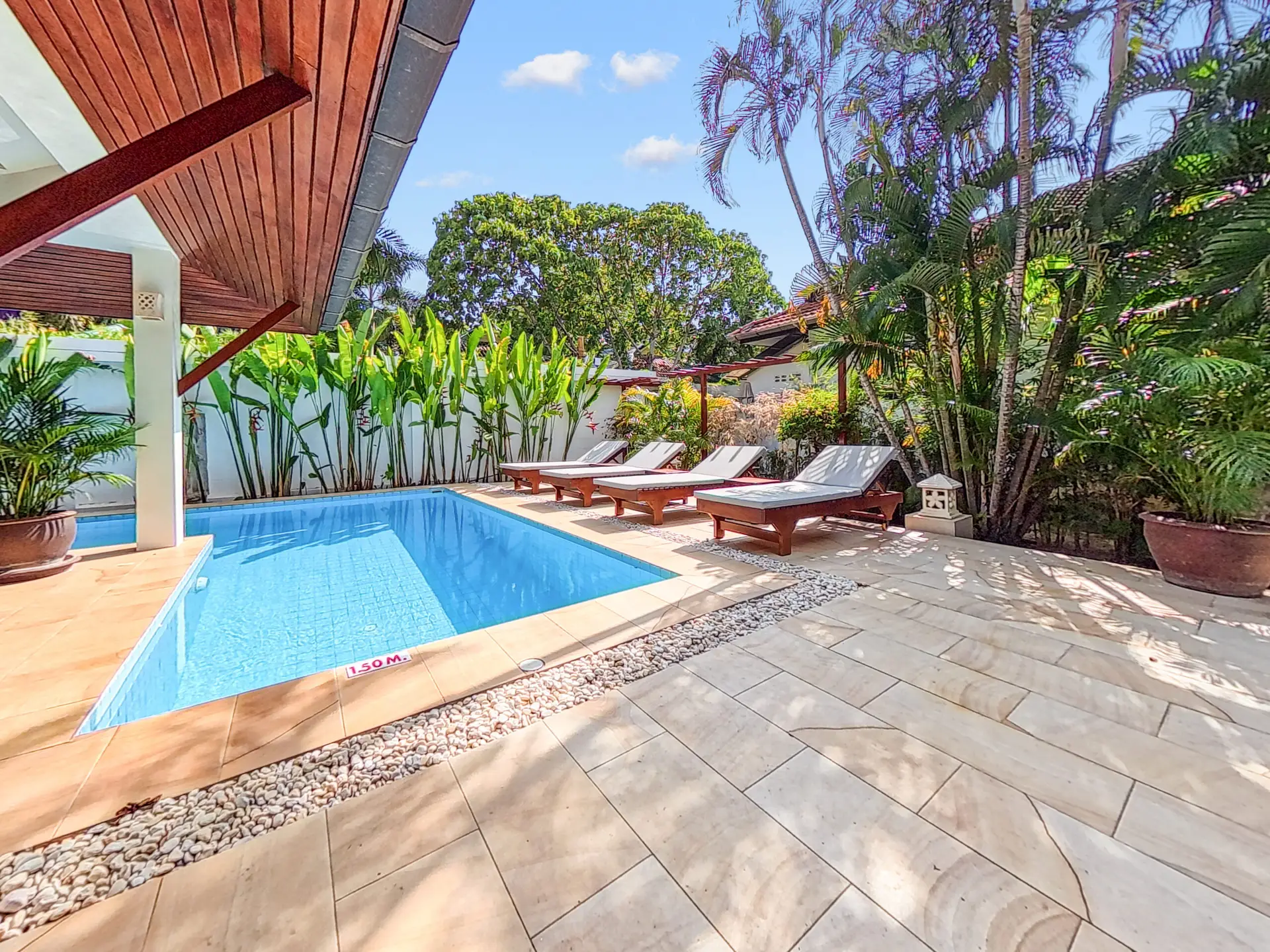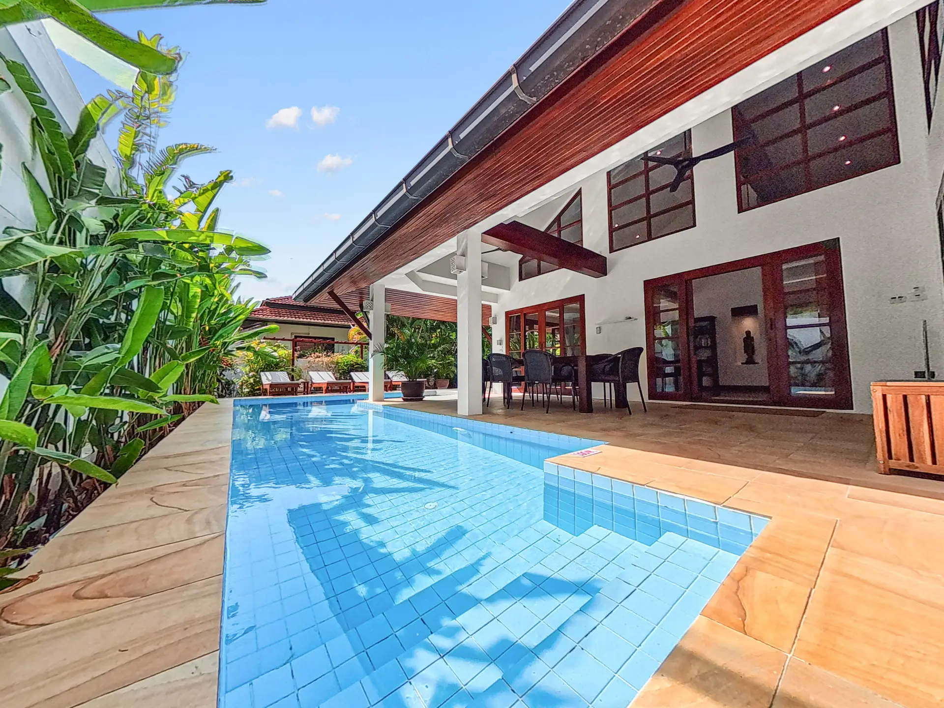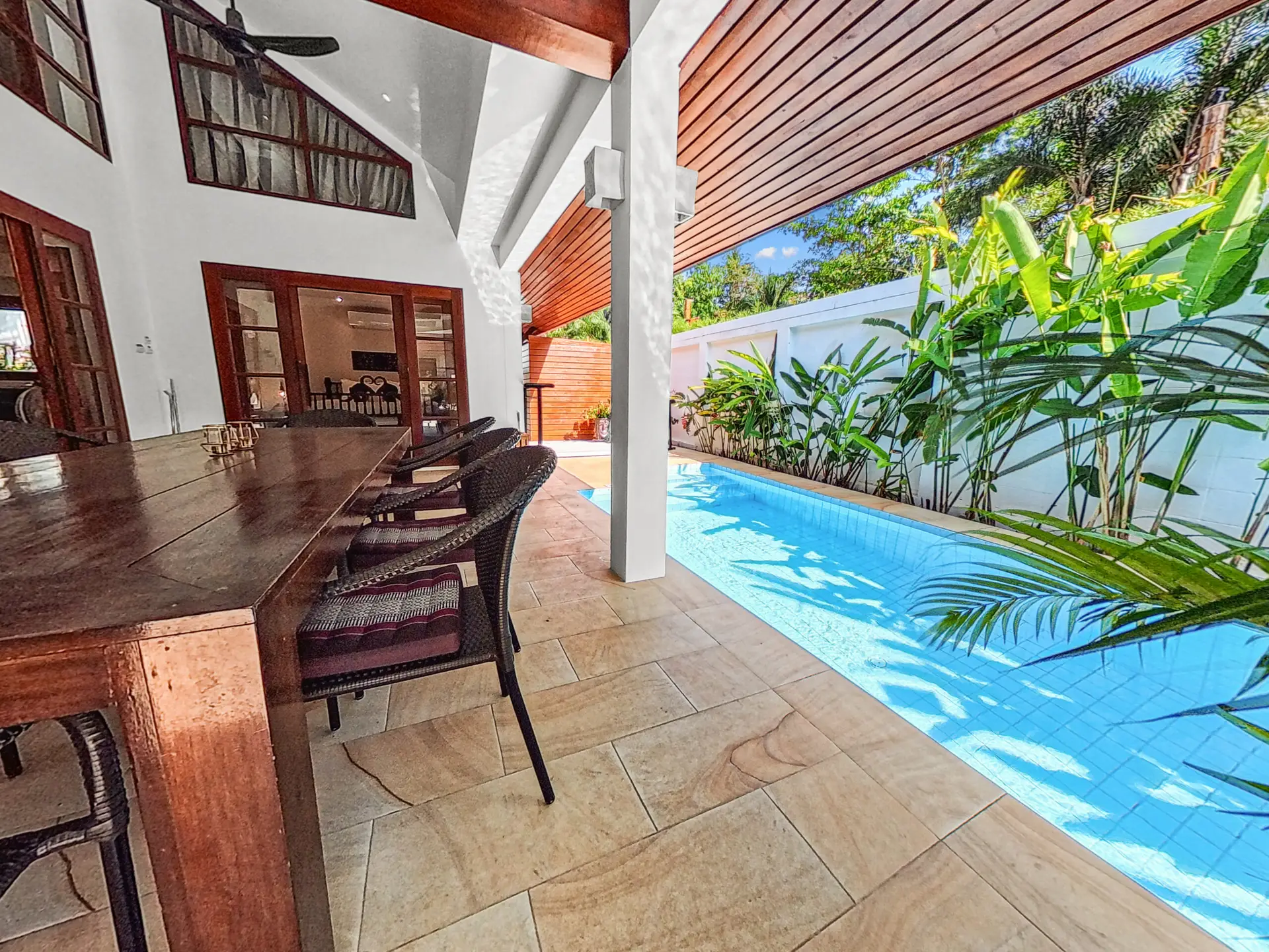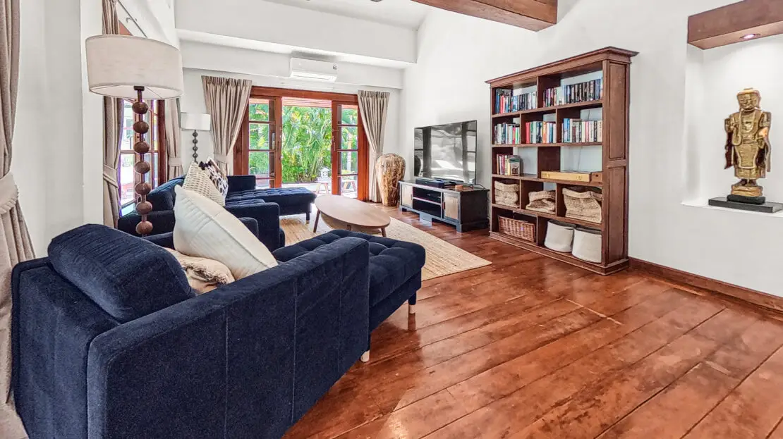Discover Malee Beach C1 – a spacious and private villa with high ceilings, a tropical garden, and a large L-shaped pool. Located just 100 meters from Long Beach, you can reach the sea and enjoy the island lifestyle within minutes. With high-speed fibre internet and two fully equipped work areas, the villa is also well suited for guests working remotely.