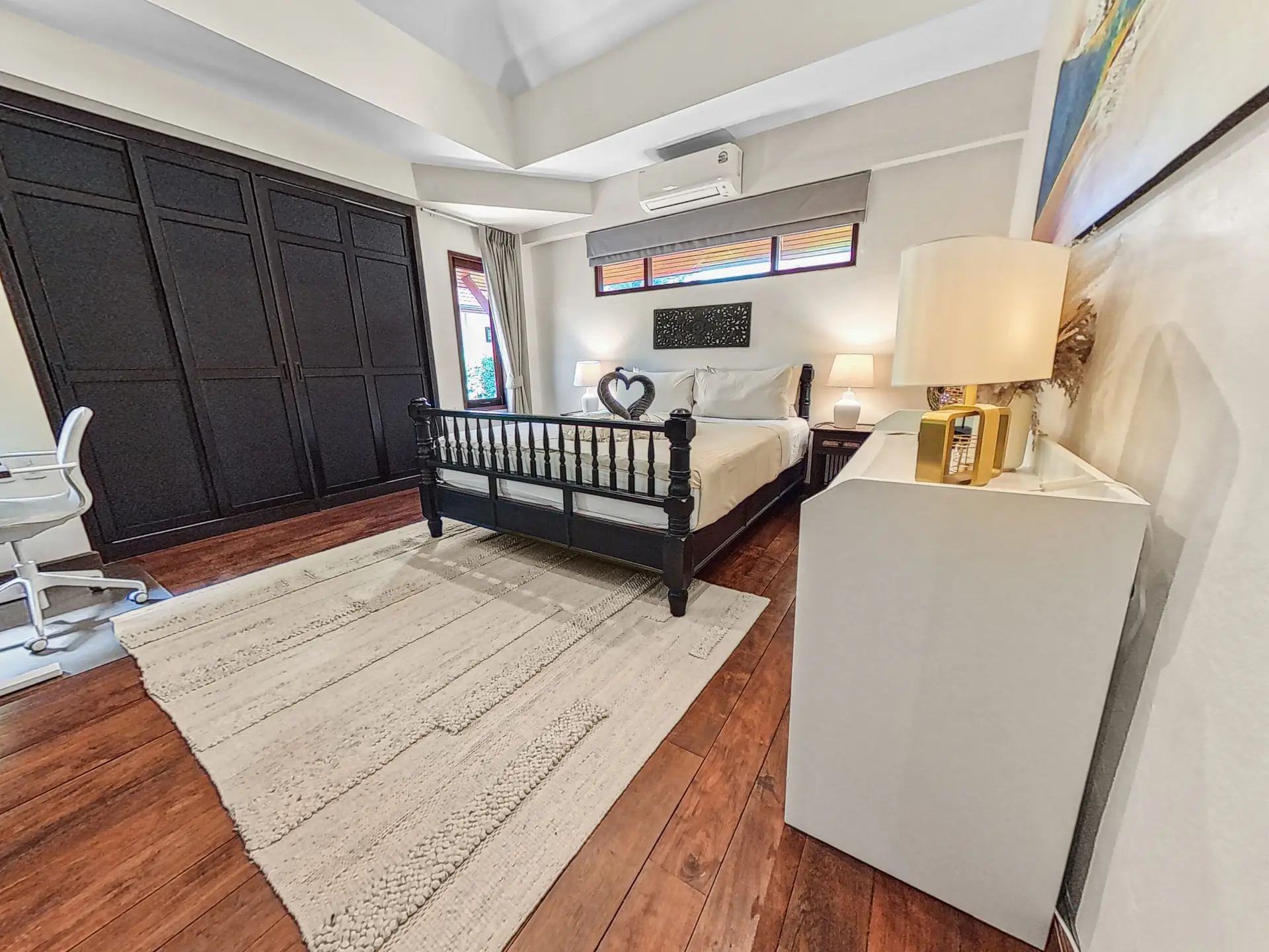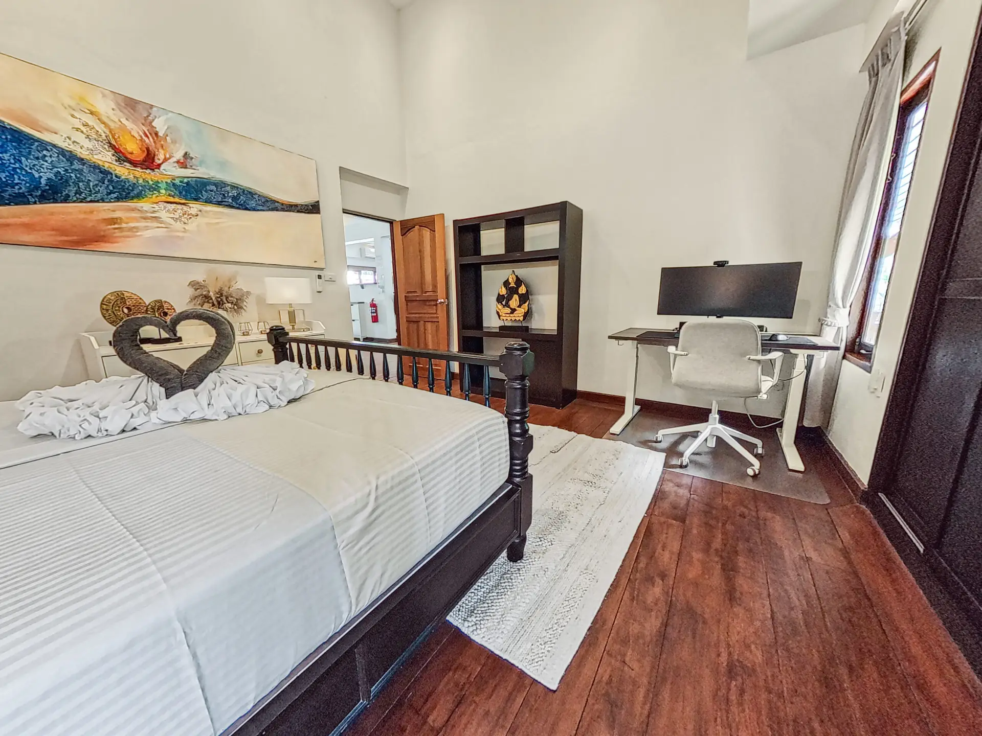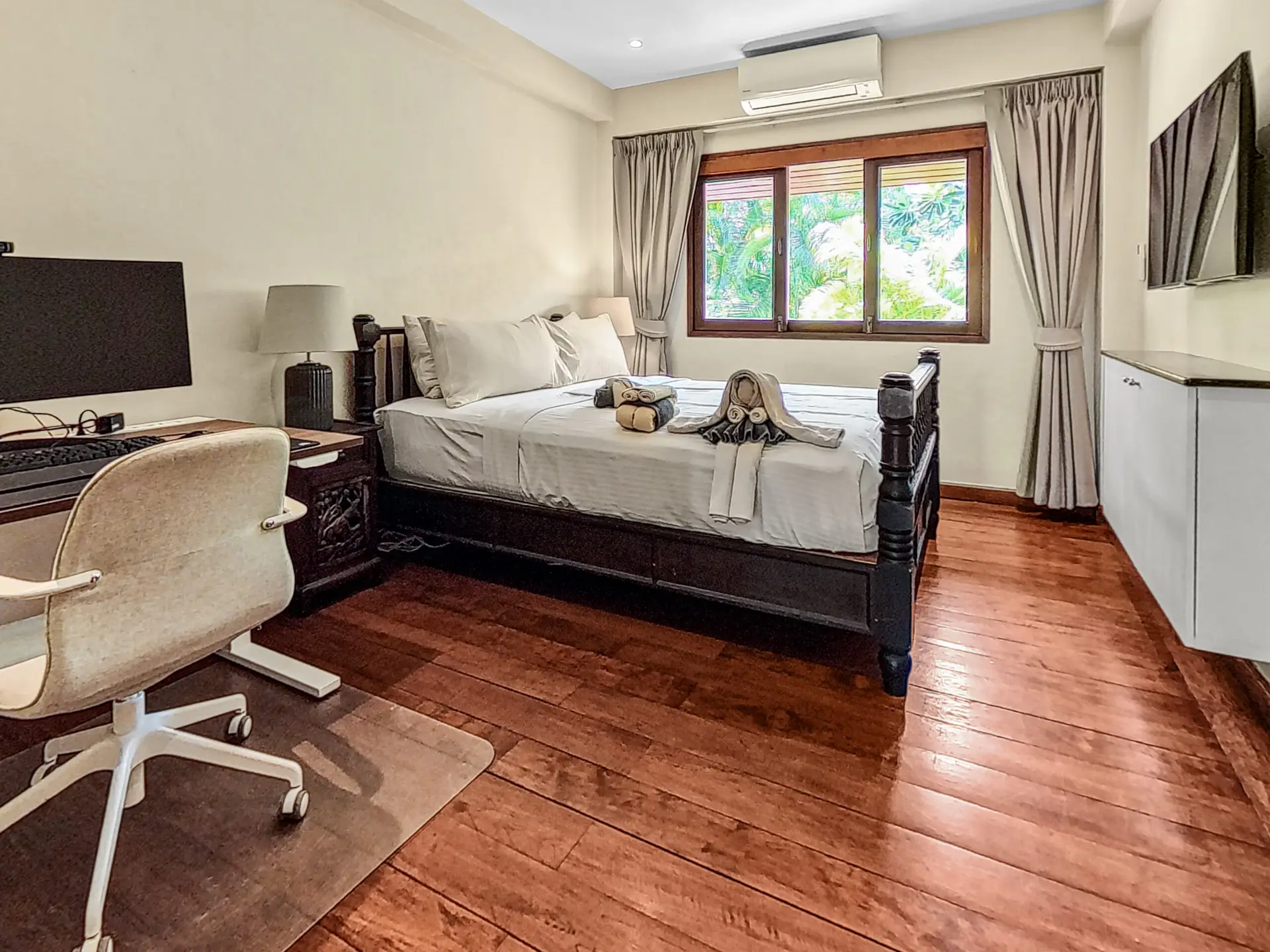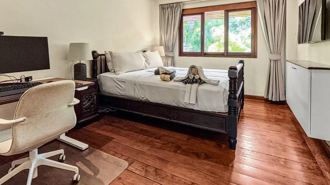 Bedroom 3 – Queen-size bed (160 cm), Wardrobe, Air conditioning, Blackout curtains, 55” Smart TV, Fully equipped workspace with height-adjustable desk, office chair, monitor, Thunderbolt docking station, webcam, keyboard and mouse