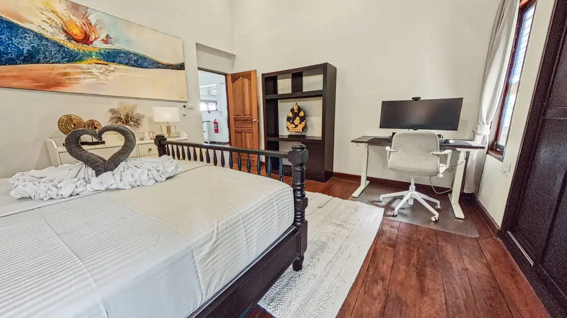 For guests who need to work, the villa is set up for remote living. There are two fully equipped workstations with adjustable desks, office chairs, monitors, docking stations and accessories, allowing two people to work comfortably at the same time. High-speed fibre internet provides a stable connection for calls, streaming and daily tasks.