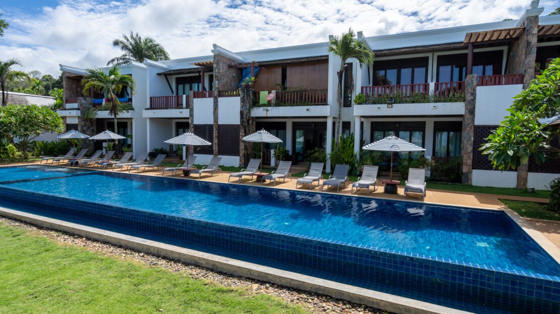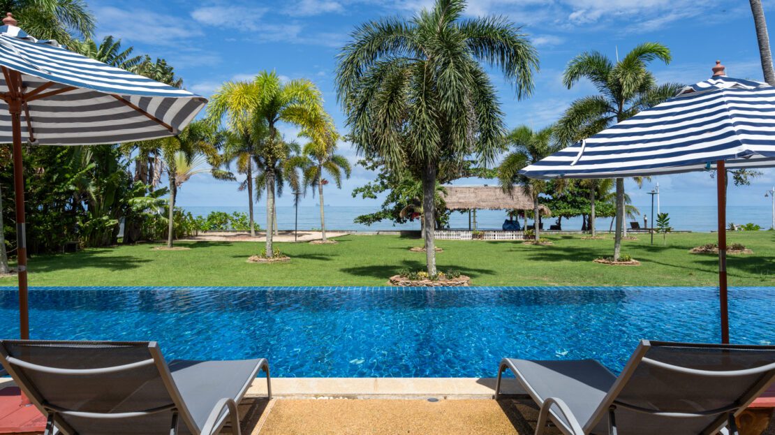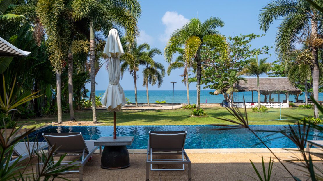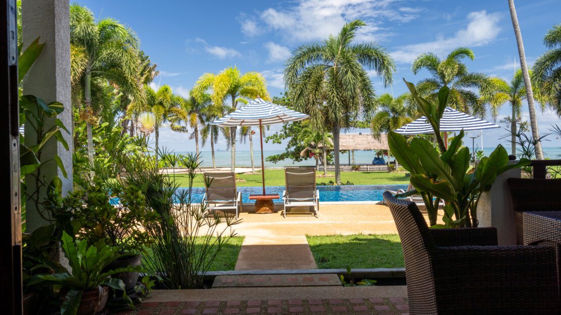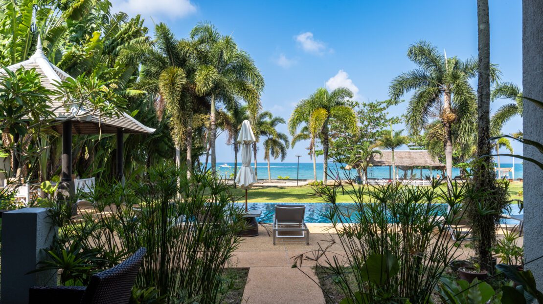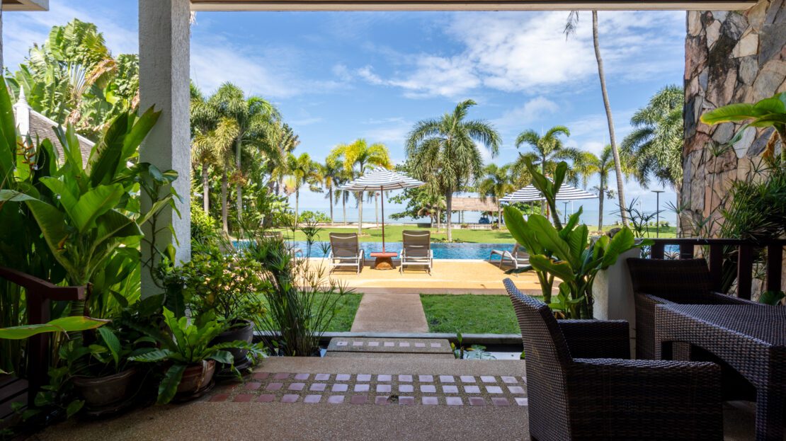 | Outside | A 20 sqm seaview terrace looks out onto the swimming pool, garden and ocean. There is a table and chairs on the terrace for outdoor dining |