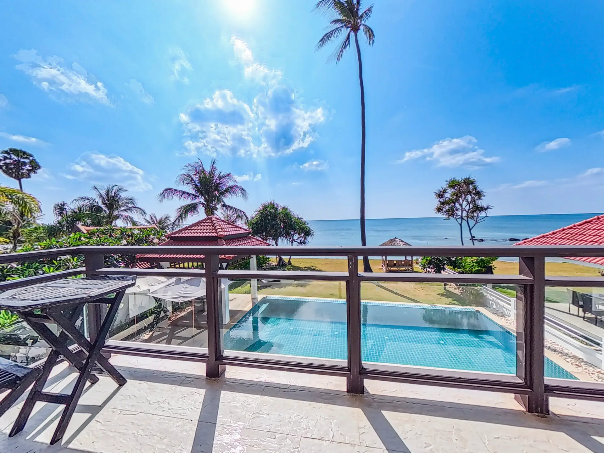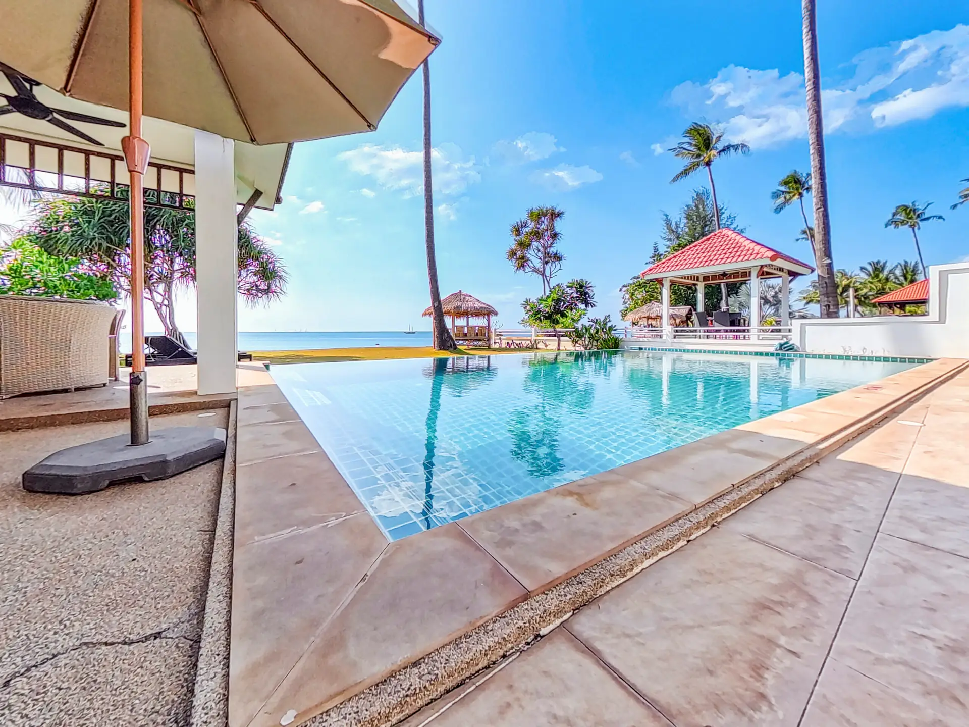 | Outside | A beach view terrace looks out onto the swimming pool, garden and ocean. There is a sofa and chairs on the terrace |