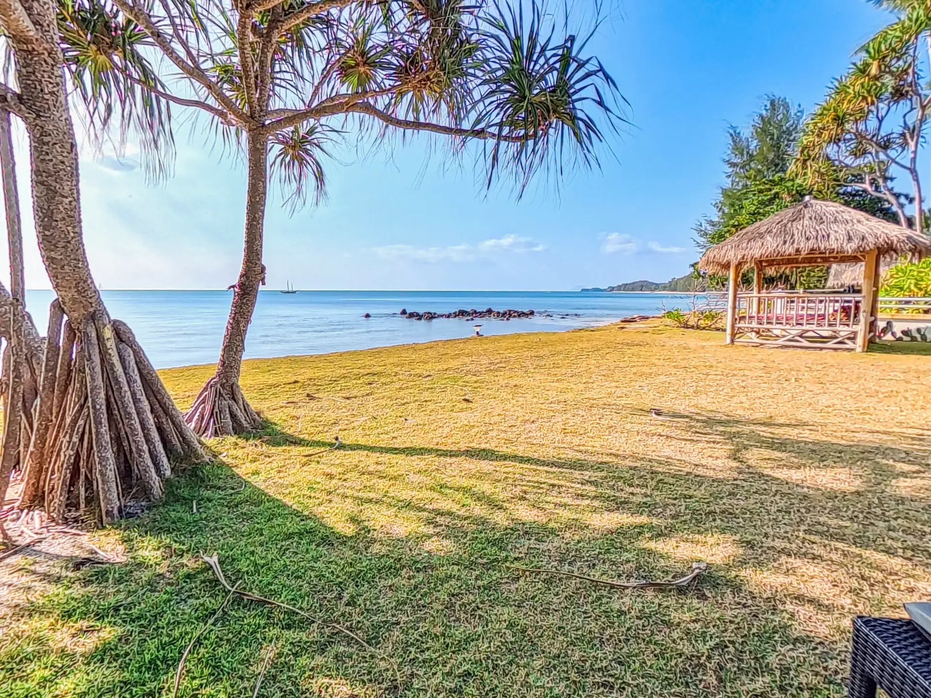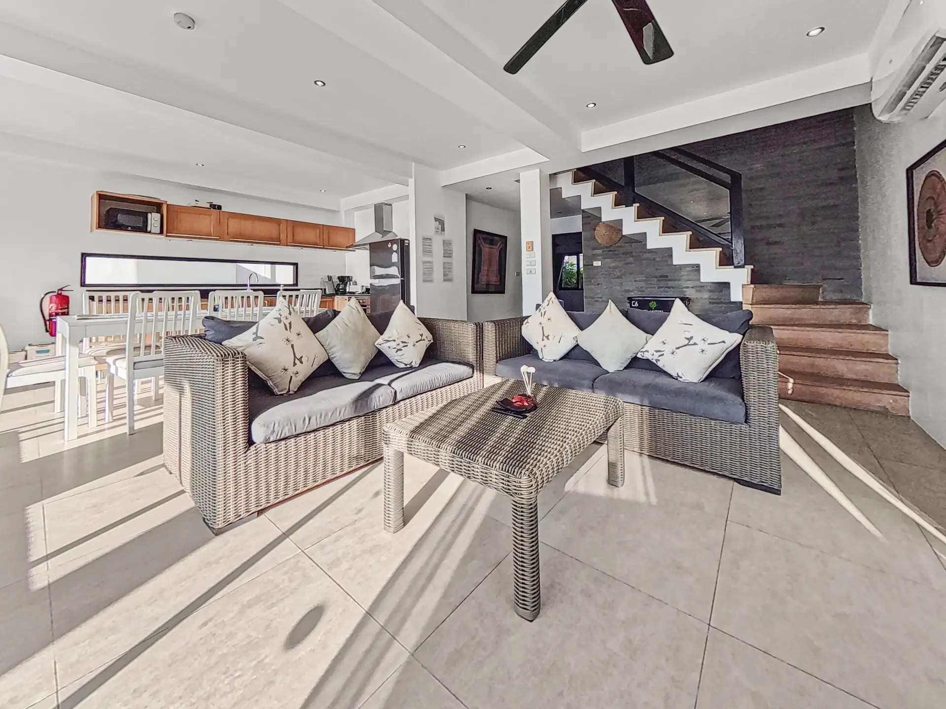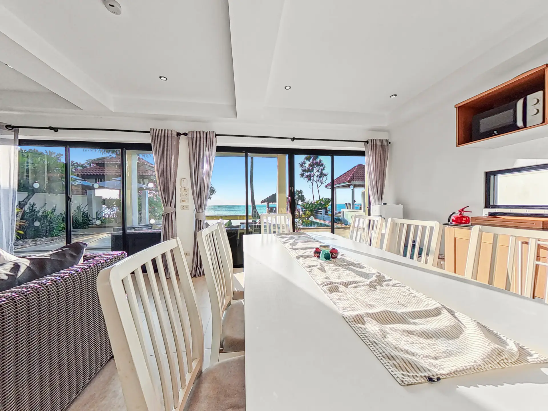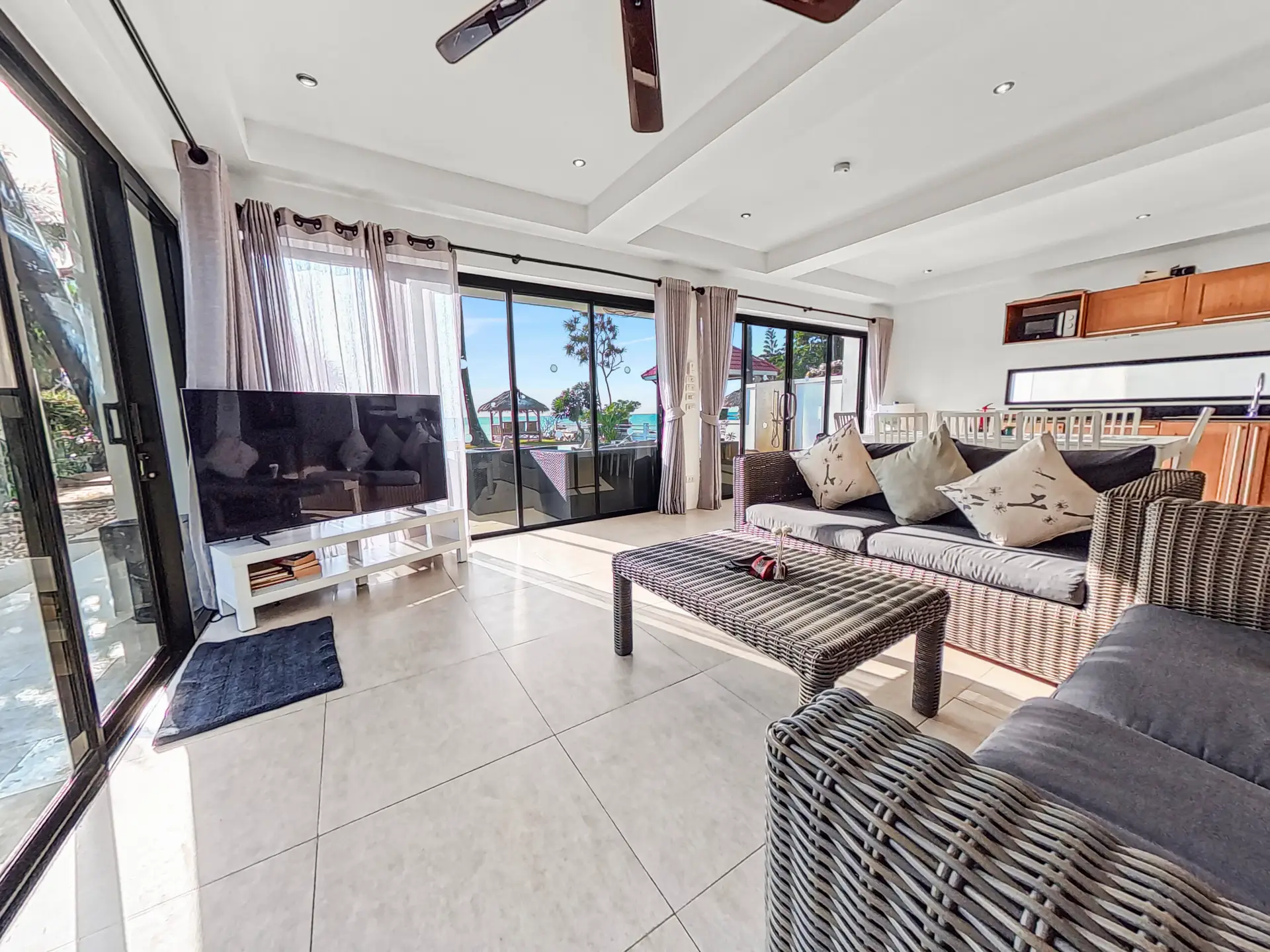 | Living | The living area is air conditioned with high ceiling. Huge, comfortable sofa with Smart TV and fan, large glass doors looking out onto the pool and beach |