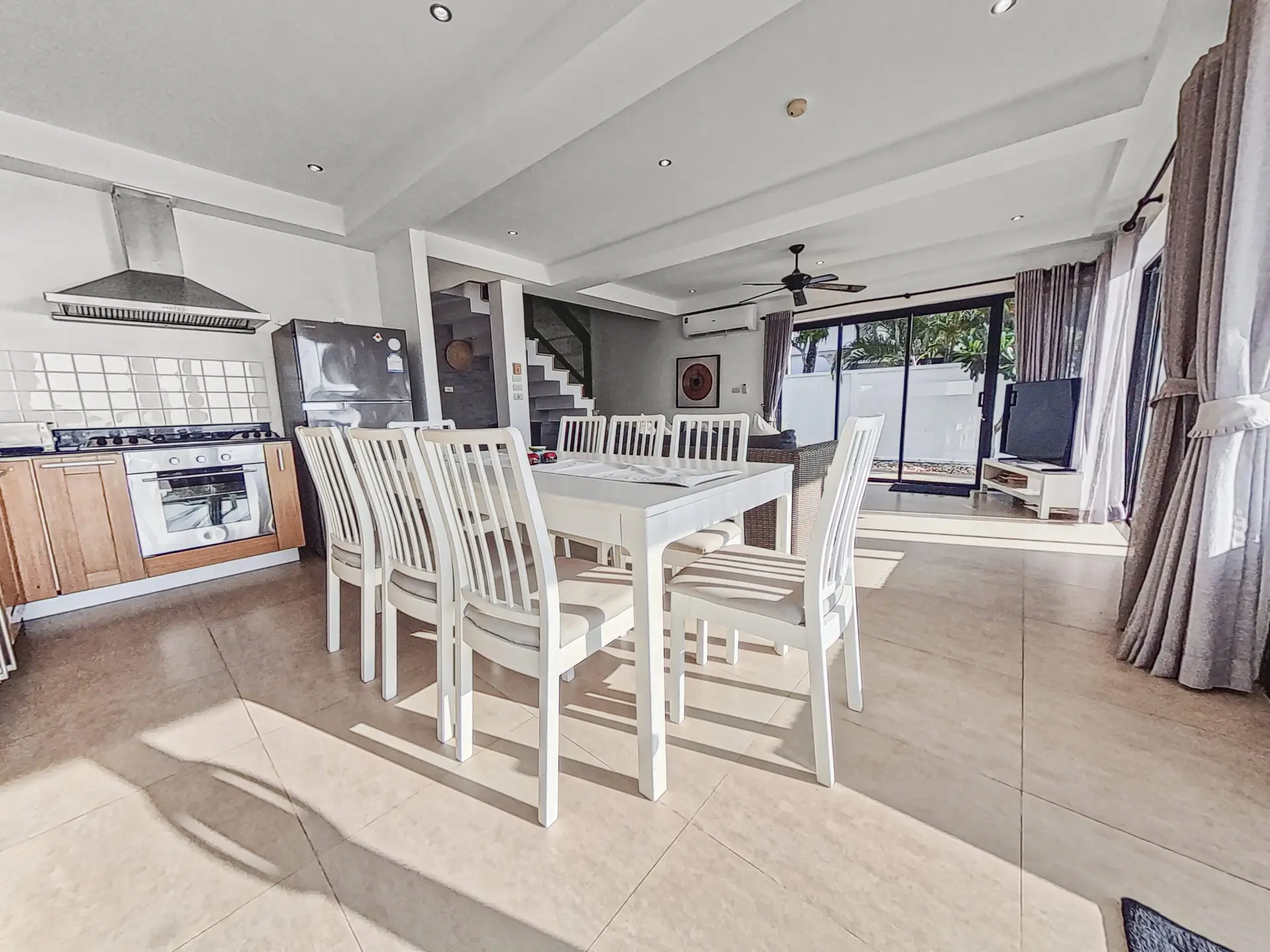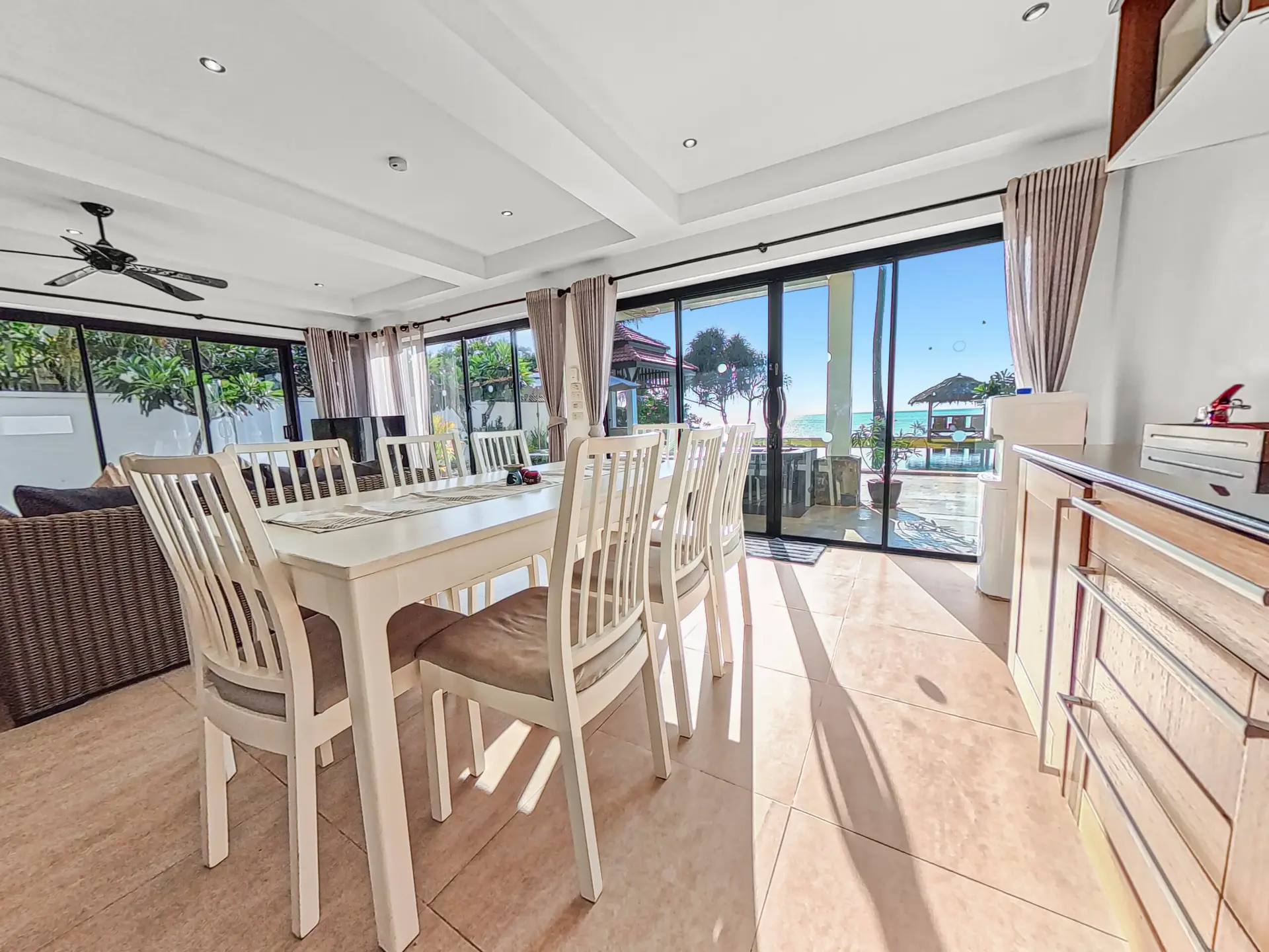 | Dining | Dining area with large wooden table+ chairs is connected to the kitchen. Large glass doors looking out onto the pool and beach |