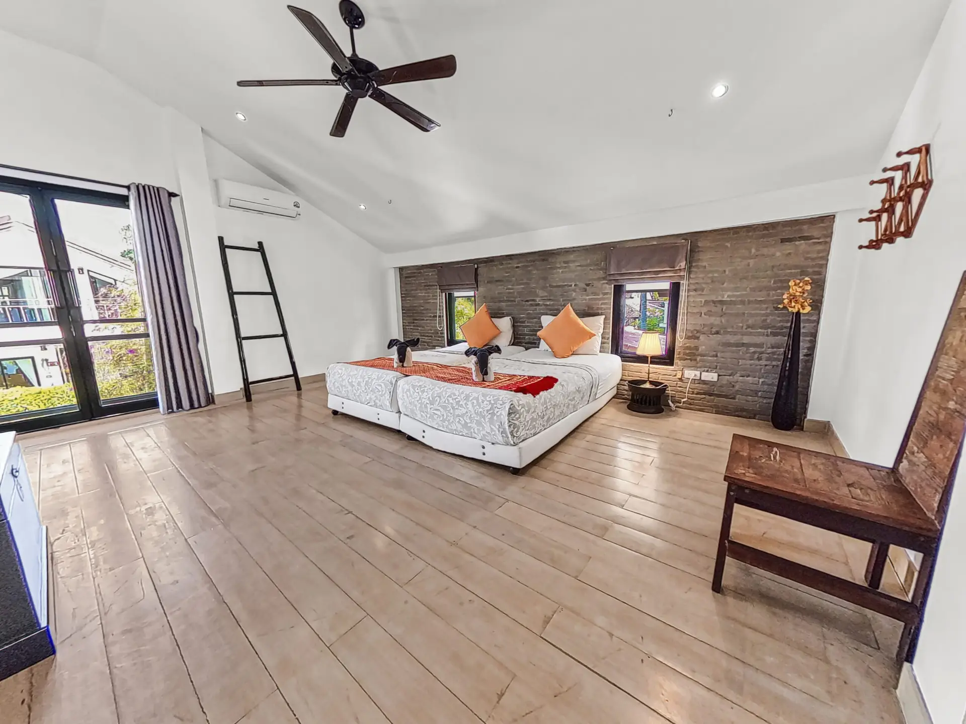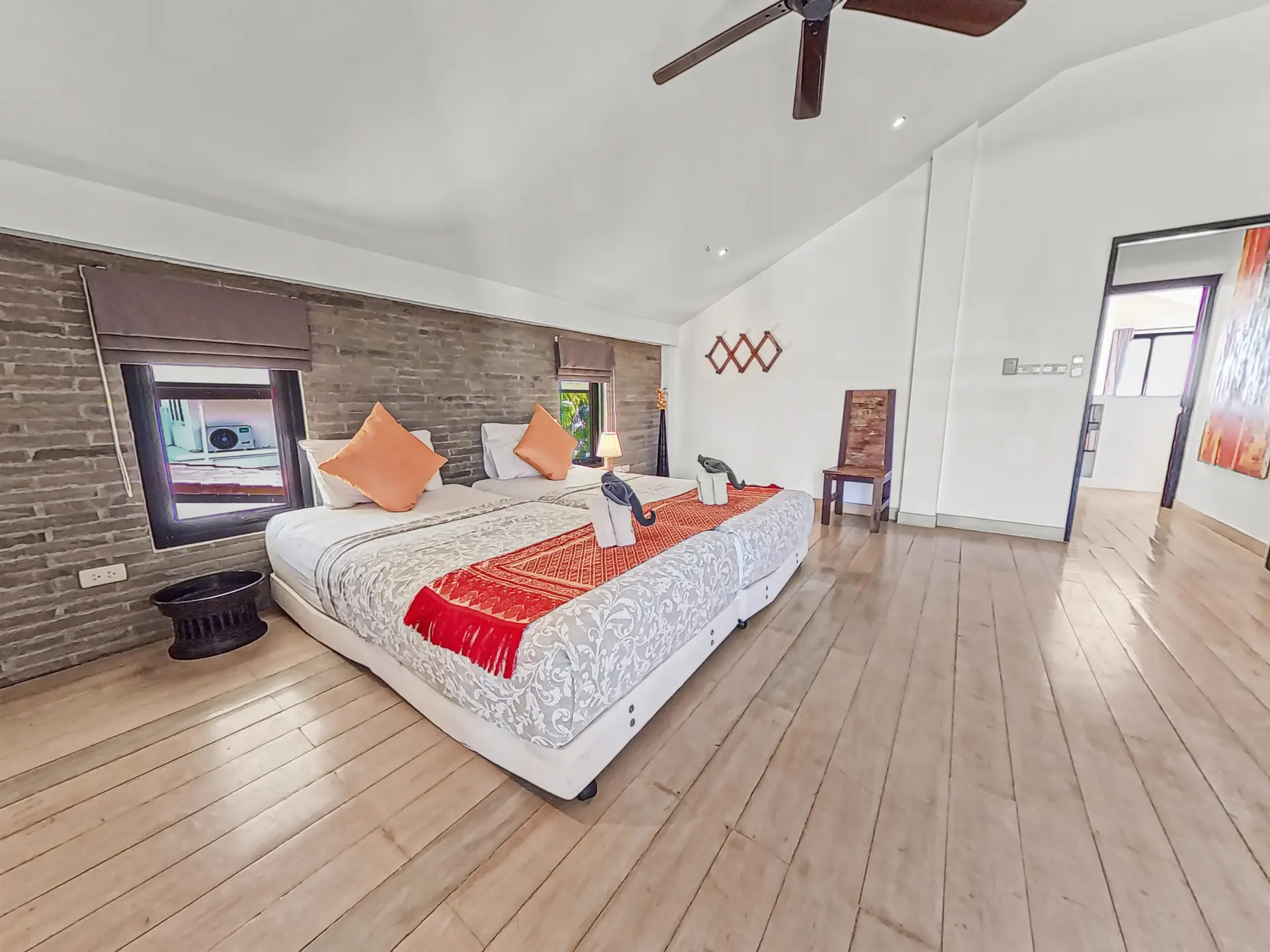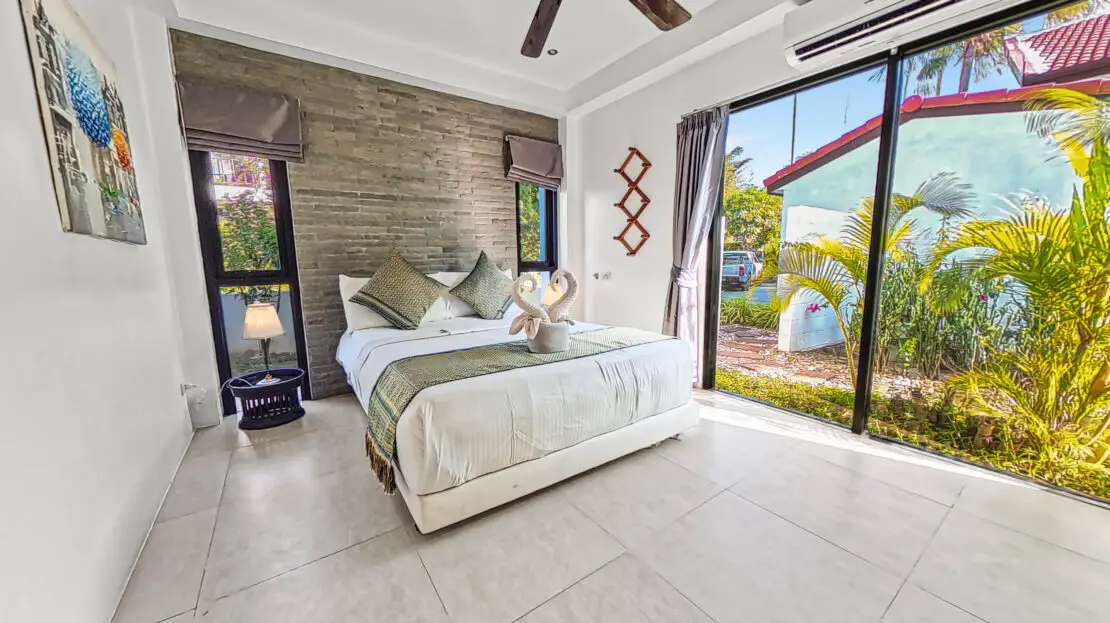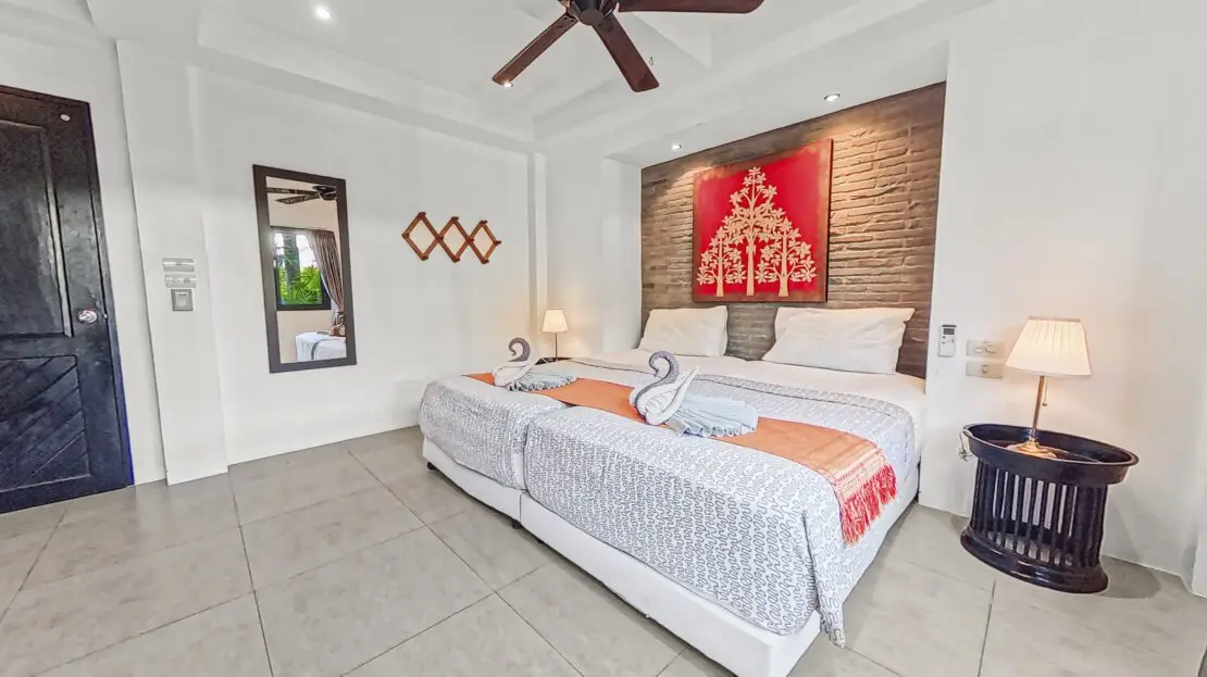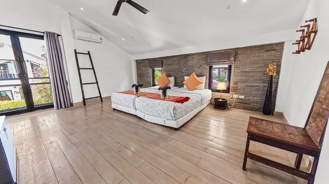 | Bedroom | Bedroom 1: Double bed, wardrobe, fan, and air conditioning Bedroom 2: Two single beds, wardrobe, fan, and air conditioning Bedroom 3: Two single beds, desk, fan, and air conditioning (upper floor) Bedroom 4: King bed, wardrobe, air conditioning, balcony access, and en-suite bathroom (upper floor) |