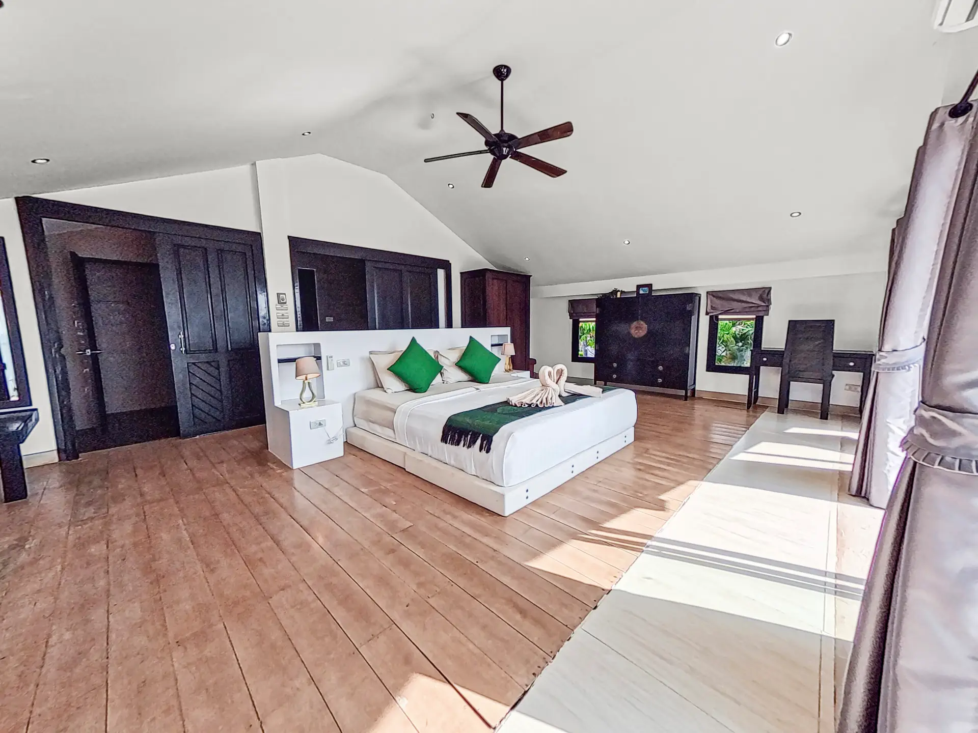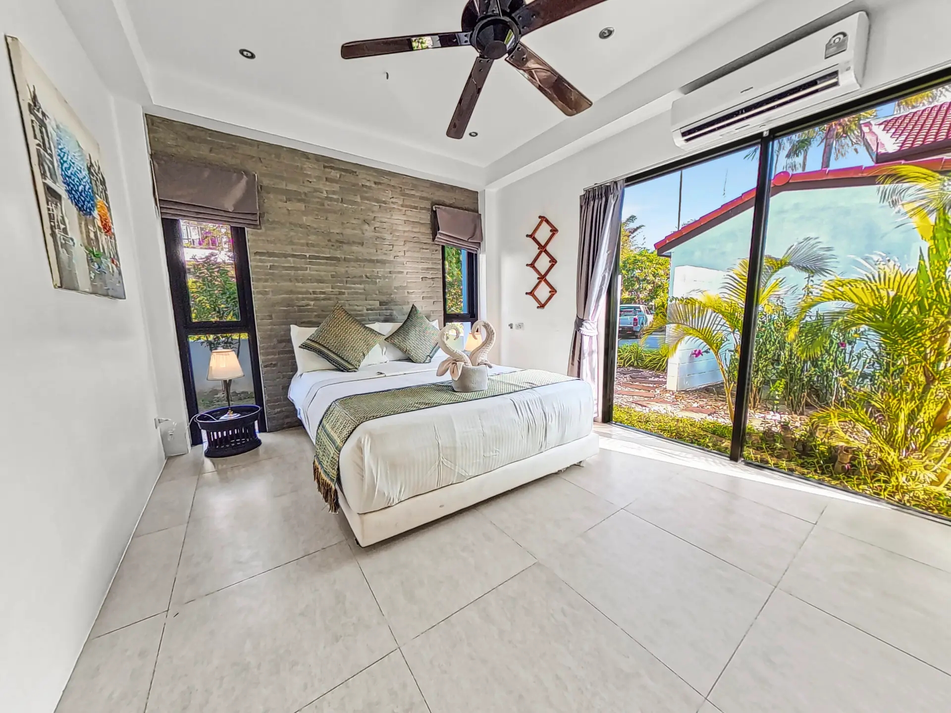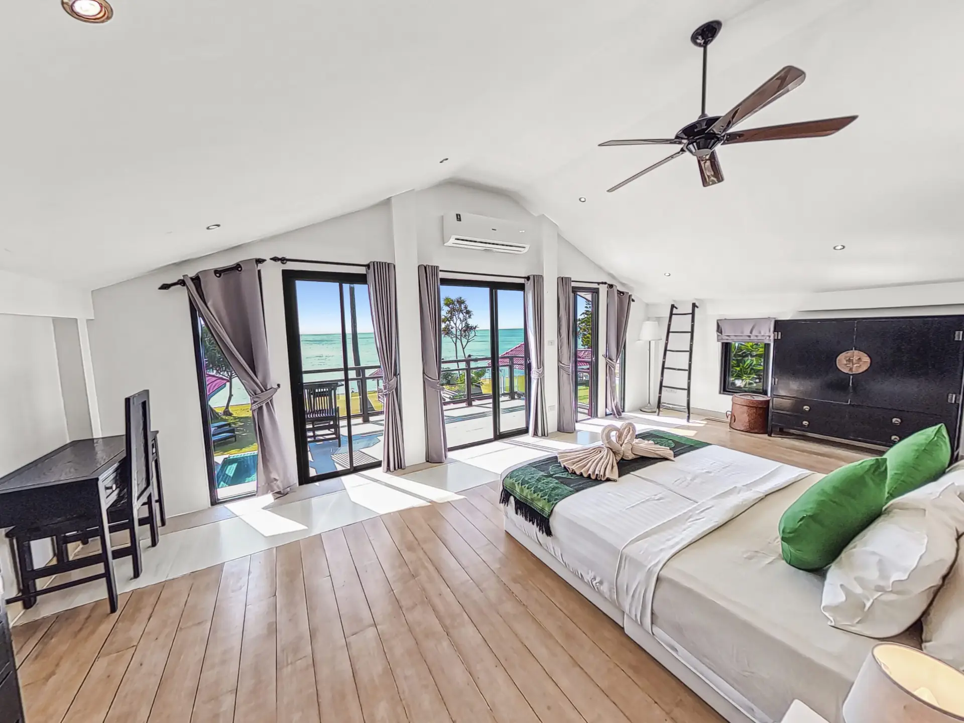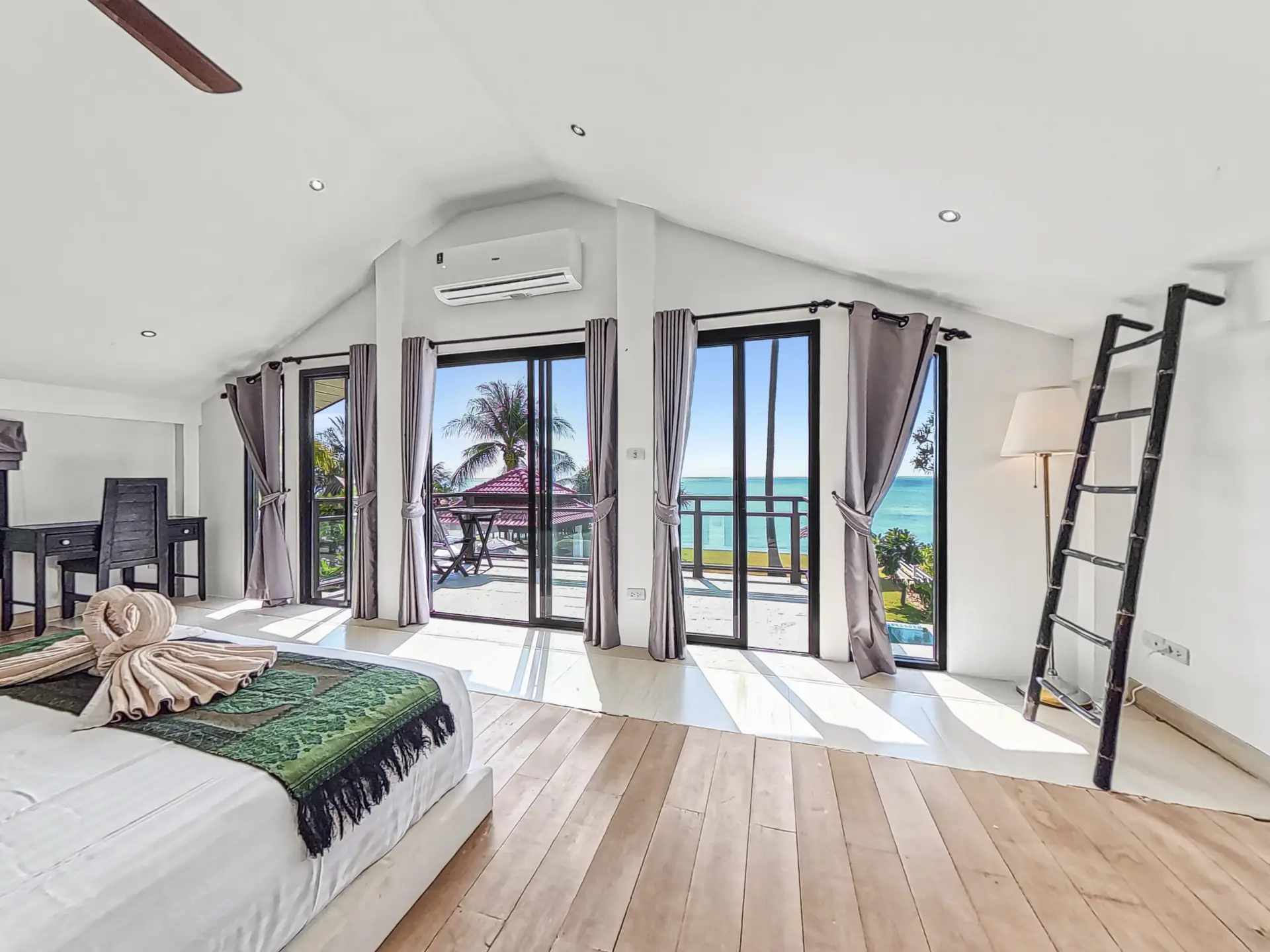 | Bedroom | Bedroom 1: Double bed, wardrobe, fan, and air conditioning Bedroom 2: Two single beds, wardrobe, fan, and air conditioning Bedroom 3: Two single beds, desk, fan, and air conditioning (upper floor) Bedroom 4: King bed, wardrobe, air conditioning, balcony access, and en-suite bathroom (upper floor) |