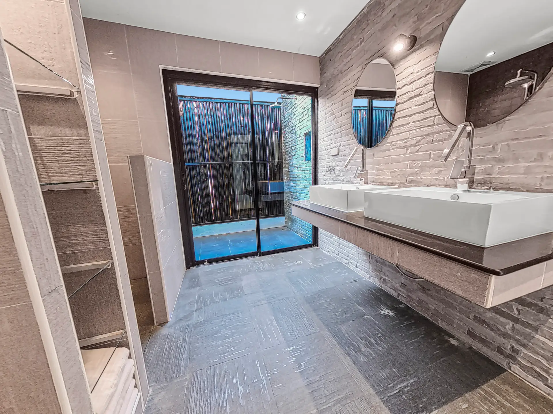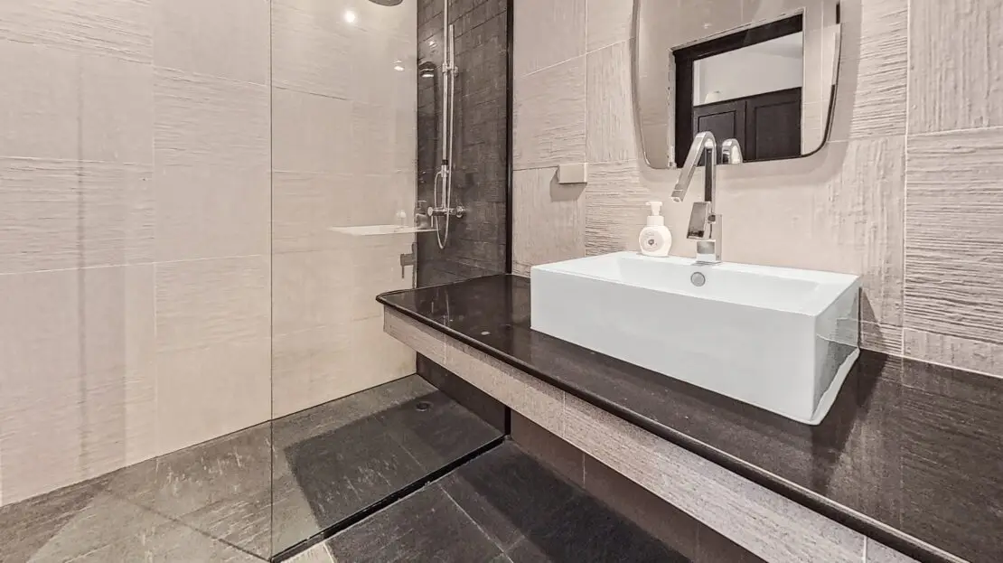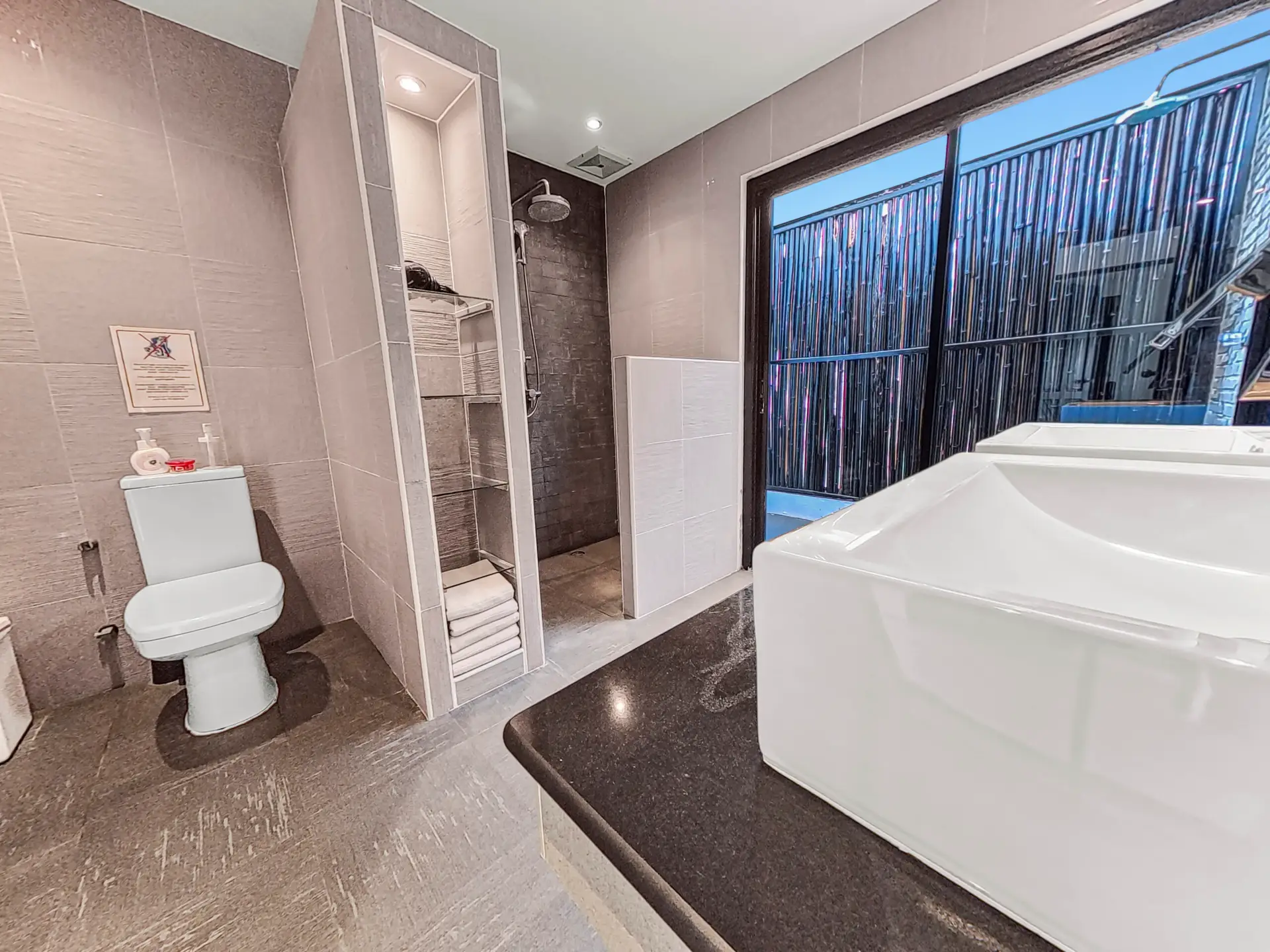 | Bathroom | Bathroom 1 (shared, lower floor) : Shower, toilet, sink, and access to an outdoor shower Bathroom 2 (ensuite, upper floor): shower, bathtub, toilet, and sink |