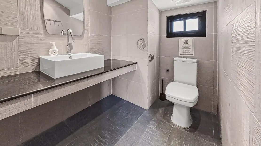 Inside, the villa offers generous living spaces with an open-plan living and dining area, plus a fully equipped kitchen. Large glass doors flood the interior with natural light and offer uninterrupted views of the sea and pool area – perfect for relaxing or entertaining.