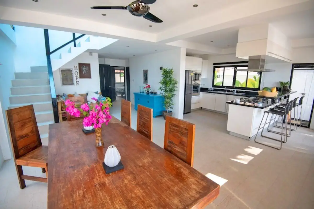 Inside, the villa features spacious open-plan living and dining areas with large glass doors that allow plenty of natural light while overlooking the pool and the sea.