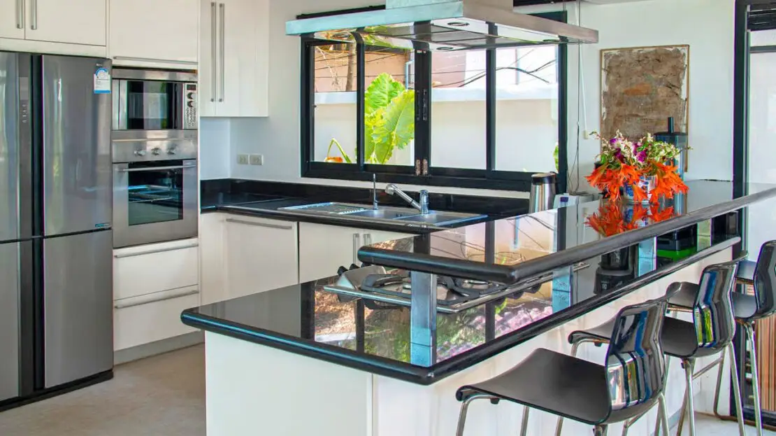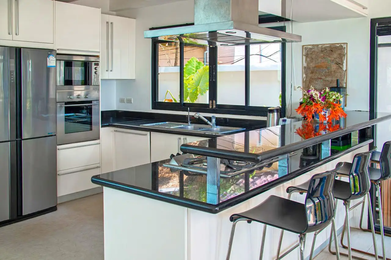 The modern kitchen includes an electric hob, microwave, coffee maker, toaster, kettle, fridge-freezer, rice cooker, and water dispenser.