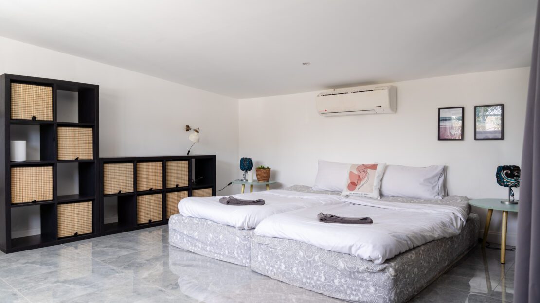 | Bedroom | All 4 bedrooms are and air-conditioned with plenty of cupboard space. Comfortable beds in all bedrooms. Master bedroom (double): 12 sqm, air conditioned, direct pool access Bedroom 2 (twin or double):17 sqm, air conditioned Bedroom 3 (bunk beds):6 sqm, air conditioned Bedroom 4 (single):11 sqm, air conditioned Bedroom 5 (double sofabed):11 sqm, air conditioned |