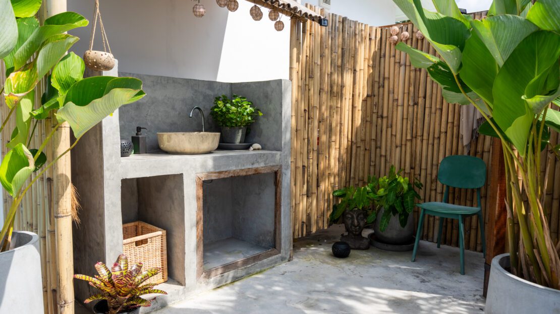 | Outside | A 120 sqm terrace with garden surrounds the cool, refreshing swimming pool (23 sqm) |