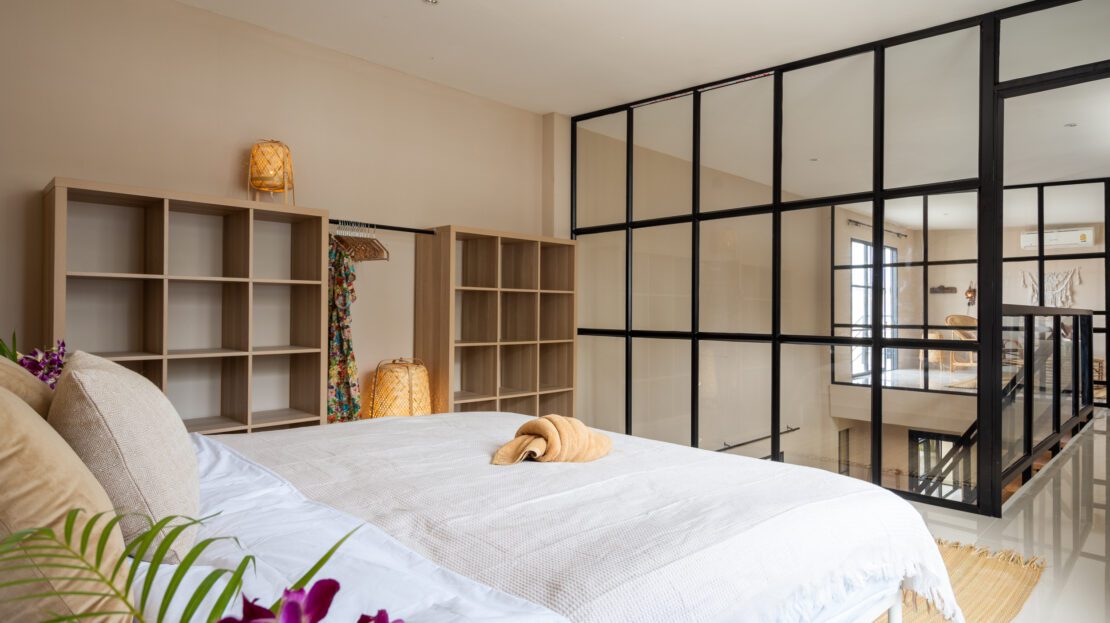 | Bedroom | All 5 bedrooms are air-conditioned with plenty of cupboard space. Comfortable bed Master bedroom 18sqm (King, 180cm) direct pool access Bedroom 2 16sqm (King, 180cm) direct pool access Bedroom 3 10sqm (queen, 150cm) Bedroom 4 20sqm (King, 180cm) Bedroom 5 20sqm (single bed 90cm) |