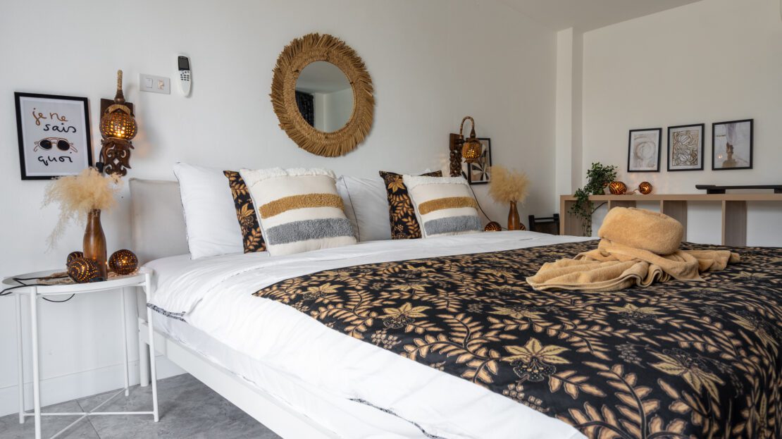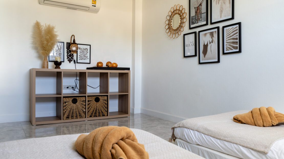 | Bedroom | All 4 bedrooms are and air-conditioned with plenty of cupboard space. Comfortable beds in all bedrooms. Master bedroom (King, 180cm): 17 sqm, air conditioned, direct pool access Bedroom 2 (double, 180cm – 1 single bed):17 sqm, air conditioned Bedroom 3 (double, 150cm):6 sqm, air conditioned Bedroom 4 (loft – 2 single beds):11 sqm, air conditioned |