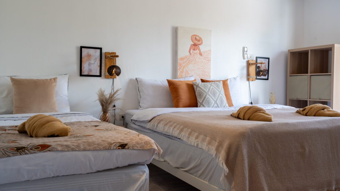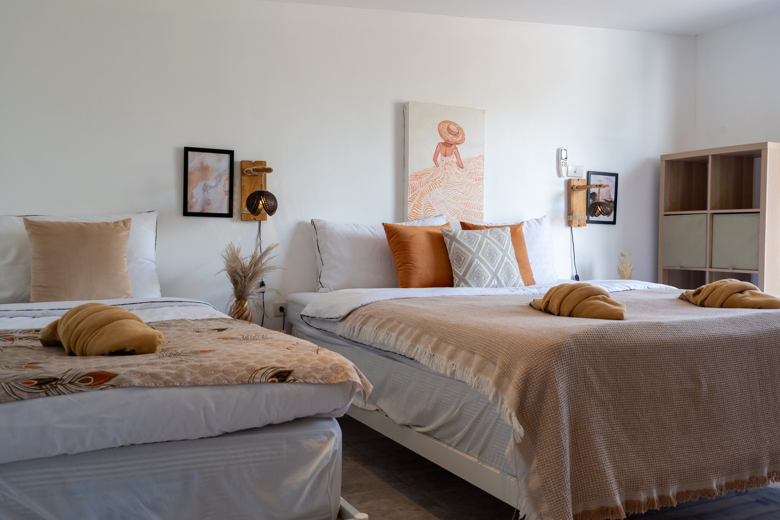 | Bedroom | All 5 bedrooms are and air-conditioned with plenty of cupboard space. Comfortable beds in all bedrooms. Master bedroom (King, 180cm): 12 sqm, air conditioned, direct pool access Bedroom 2 (King 180cm): 12 sqm, air conditioned, direct pool access Bedroom 3 (Queen 150cm):6 sqm, air conditioned Bedroom 4 (loft, double bed):17 sqm, air conditioned Bedroom 5 (loft, twin beds):11 sqm, air conditioned |