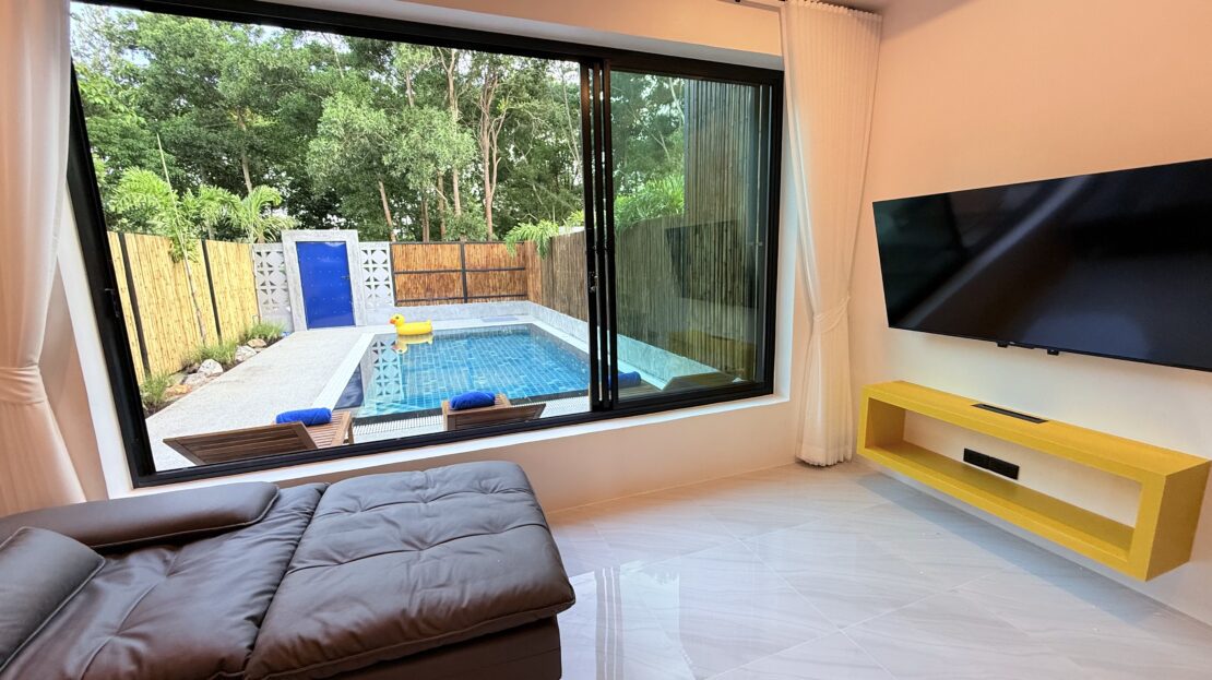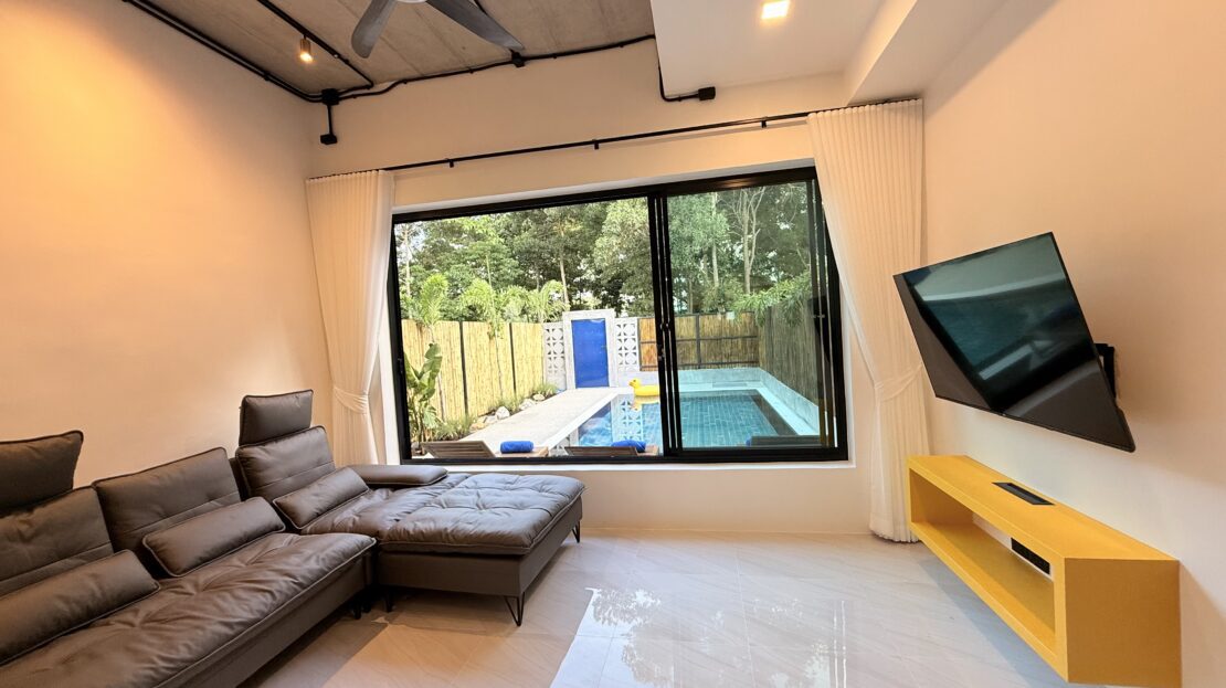 Living The living area is air conditioned with high ceiling. Huge, comfortable sofa with Smart TV and ceiling fan, large window looking out to the pool