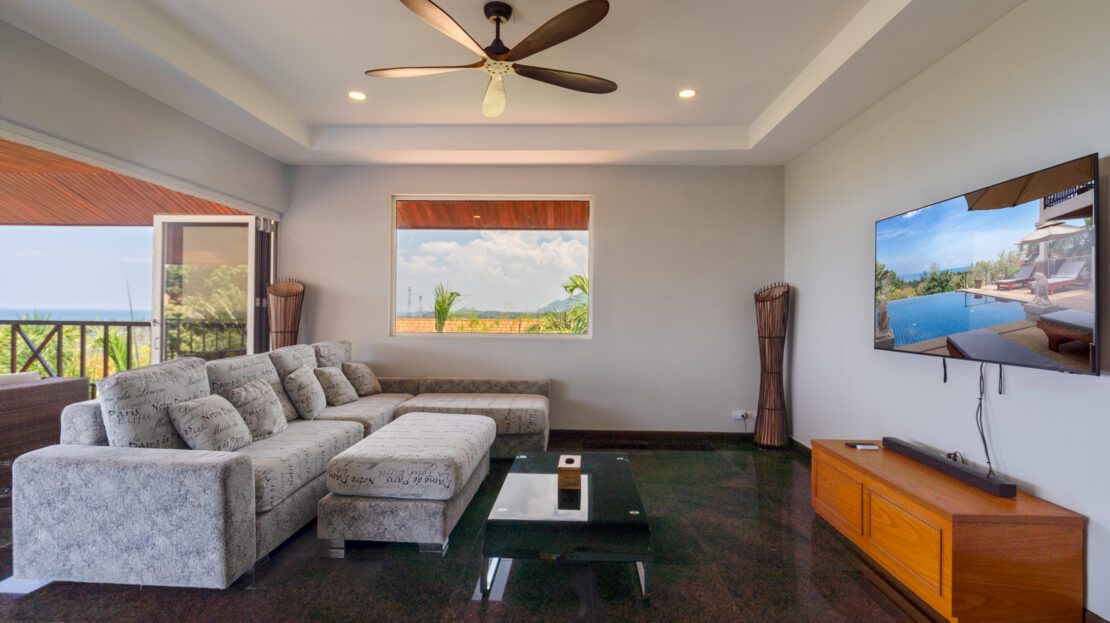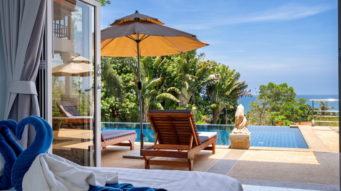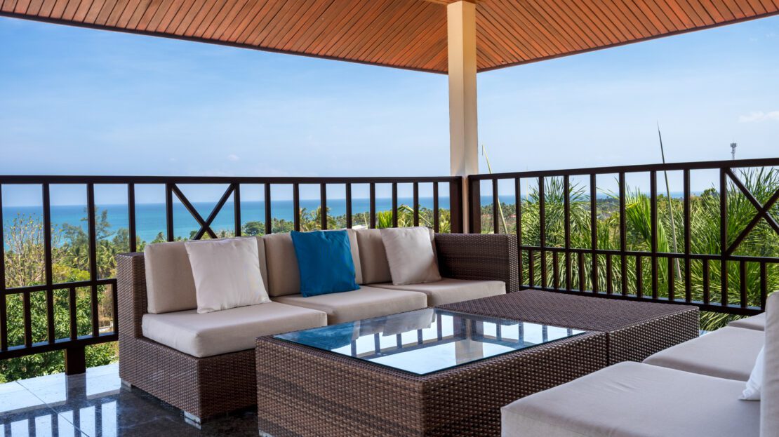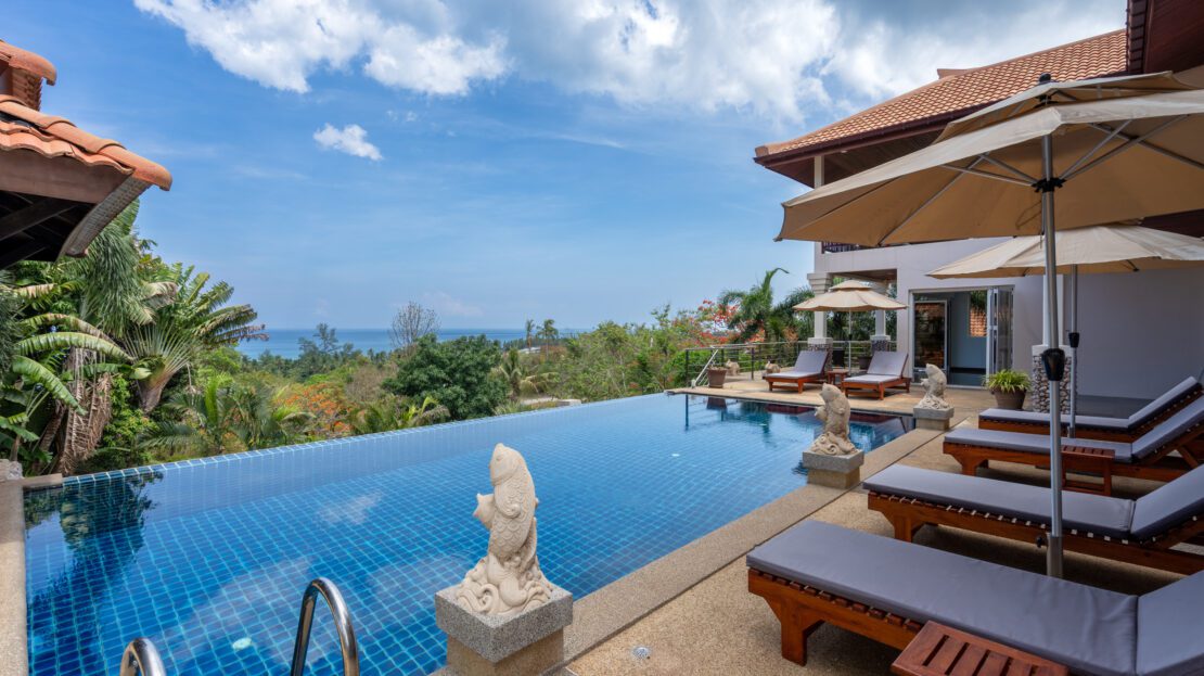 | Outside | There are two large outdoor terraces, plus a private terrace from the master bedroom. A huge poolside terrace with shaded pavilion, sun beds, outdoor sofa and more! Lush tropical garden and did we mention the sea view? |