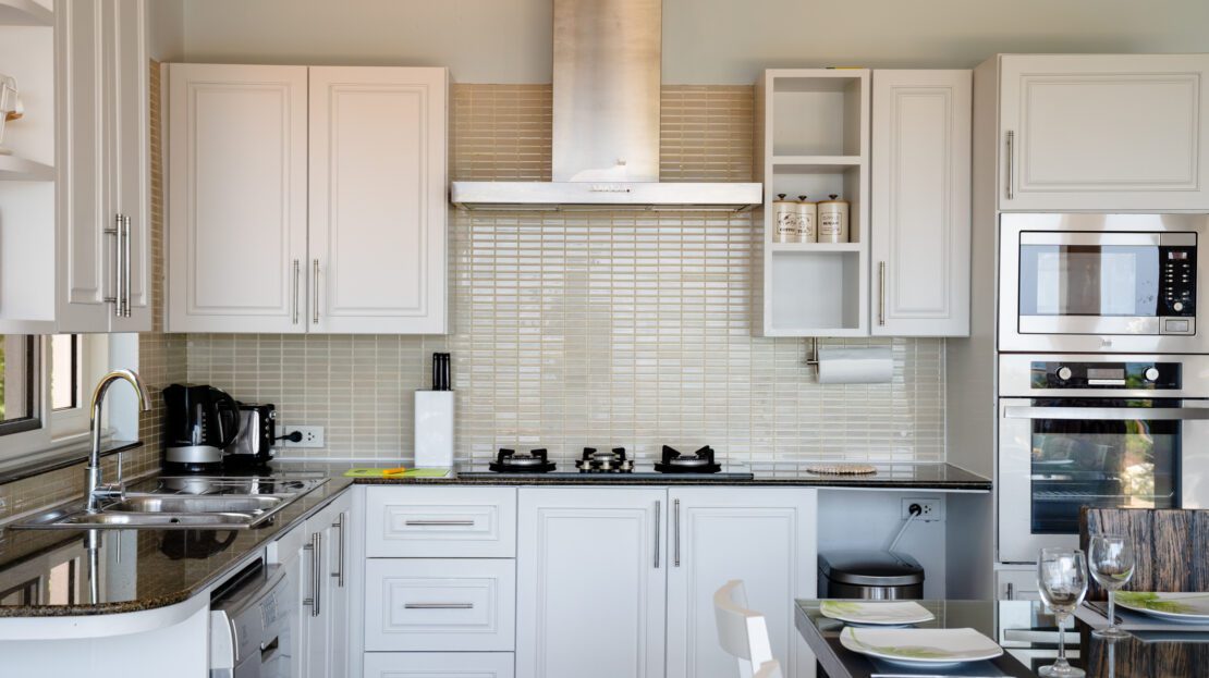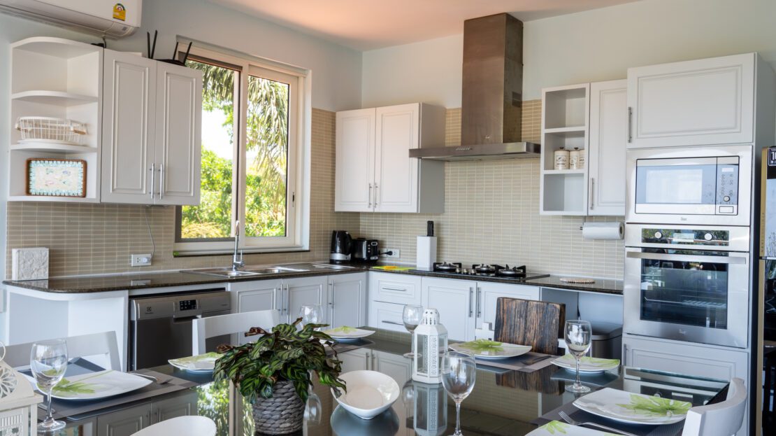 | Kitchen | The kitchen opens out onto the upper terrace, open up the huge sliding doors for a cool sea breeze, or close them and take advantage of an air conditioned room with sea view! Fully fitted with western cooking appliances and utensils, this kitchen is the perfect place to prepare a snack or a full meal. All the following are provided: oven and stove, dishwasher, fridge-freezer, microwave, blender, coffee maker, kettle, plenty of utensils, full crockery |