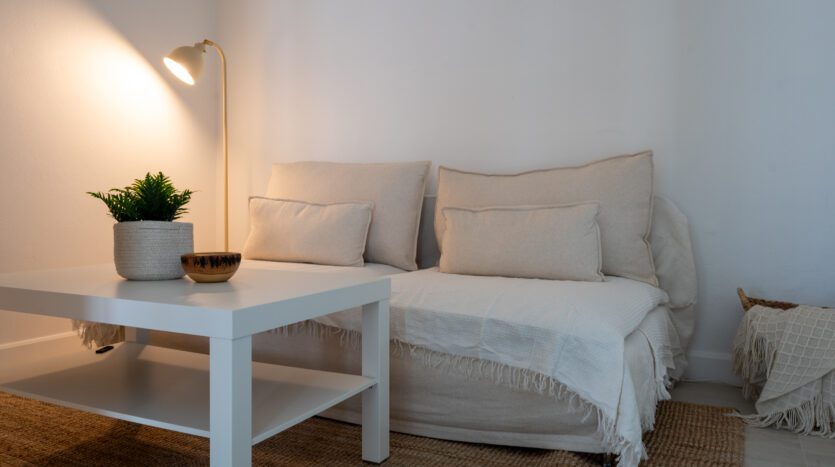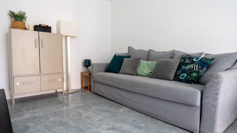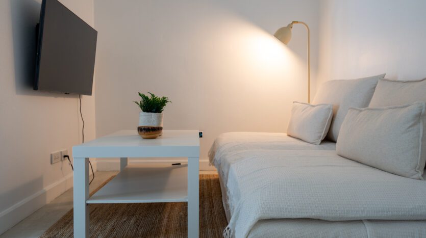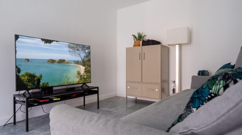 | Living | Living area has a large comfortable sofa and TV |